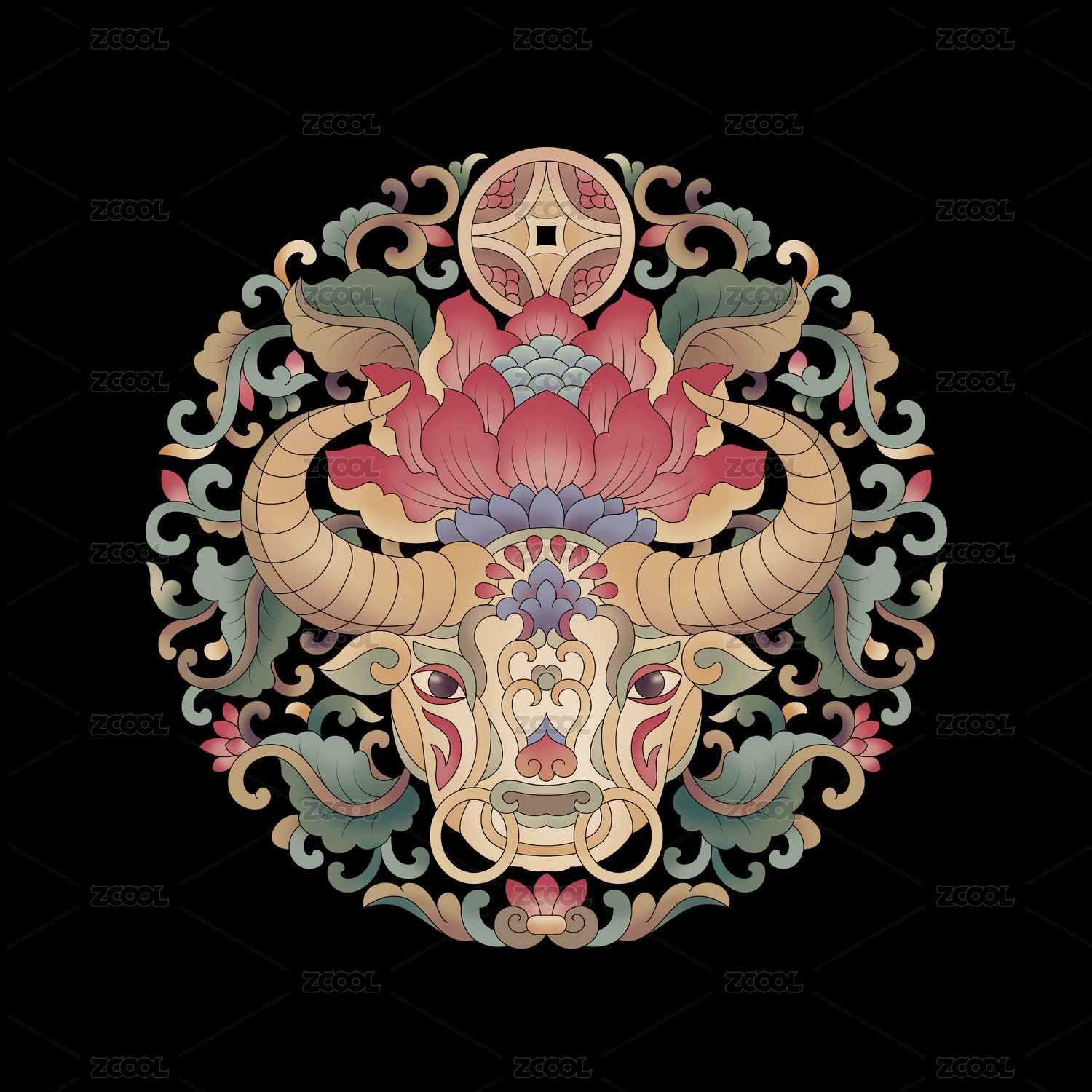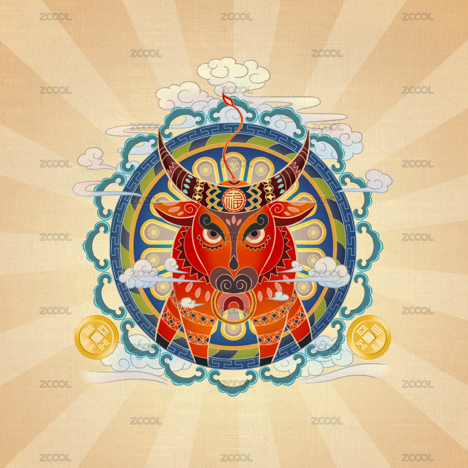 牛年生肖传统吉祥图符牛气冲天 金底直角