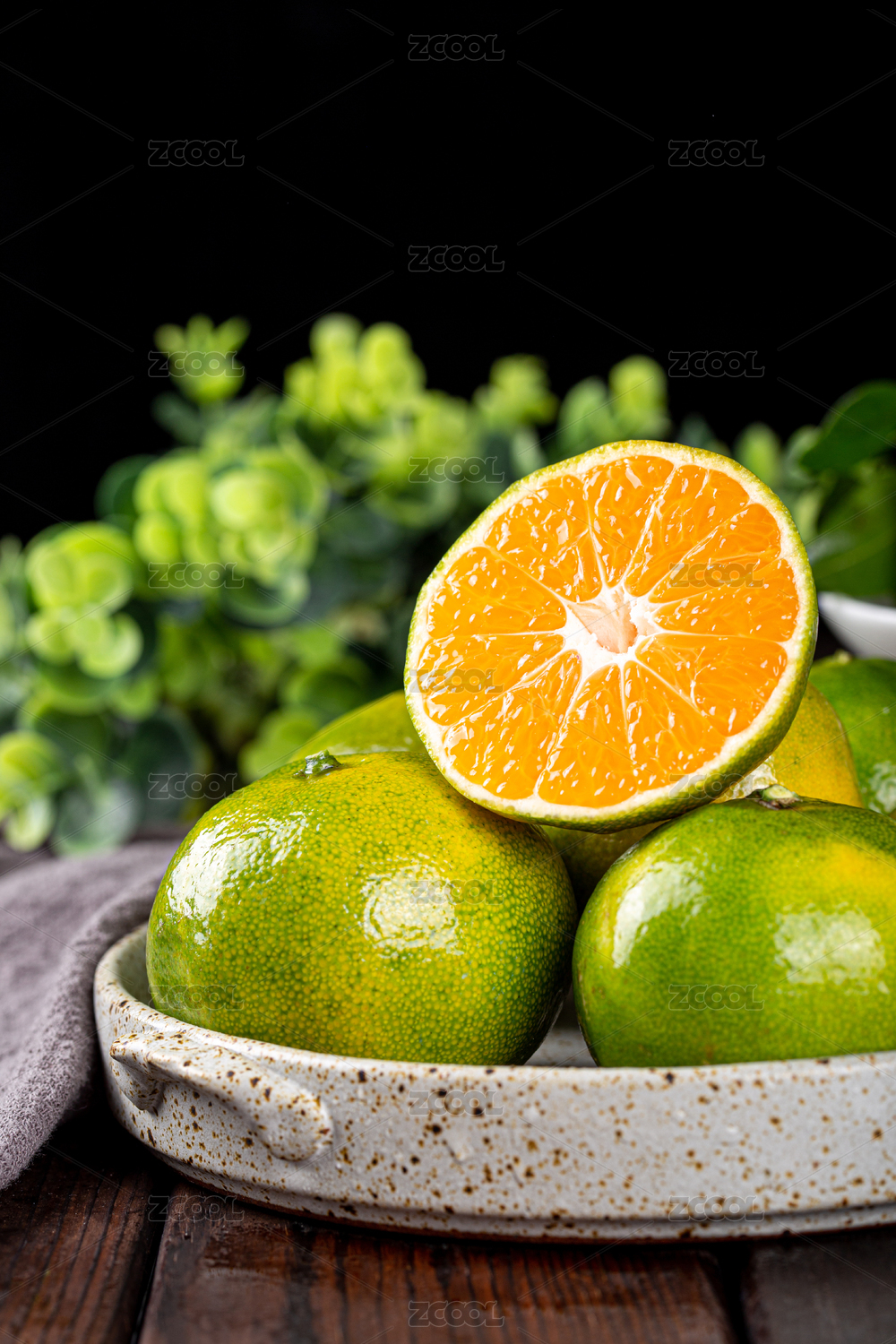 黑底上放着蜜桔和蜜桔片