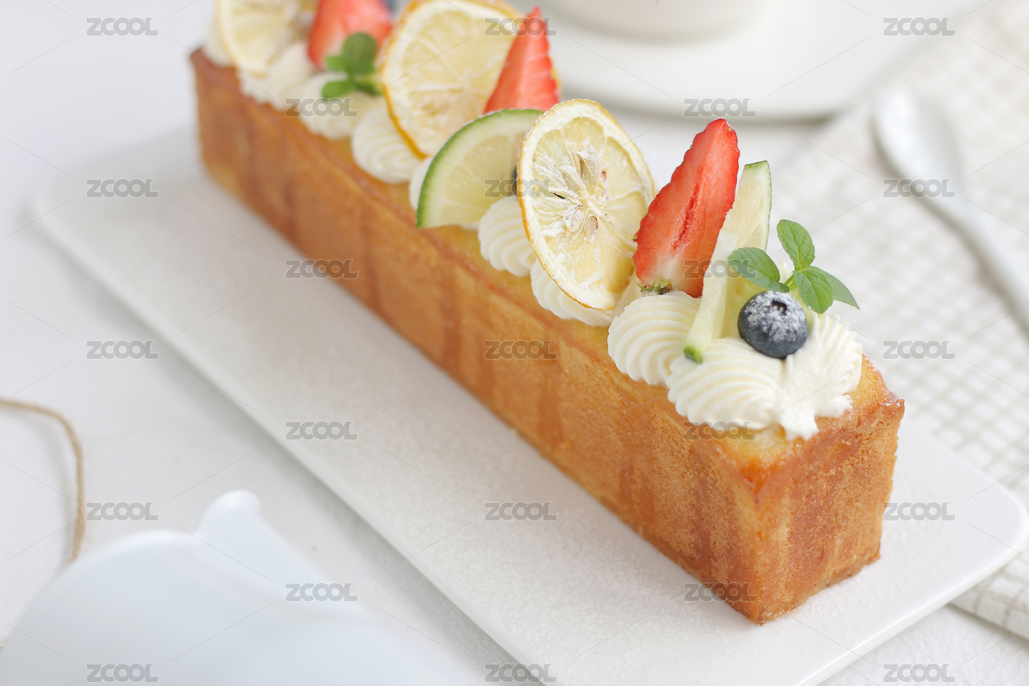 用水果和奶油装饰的长条形柠檬磅蛋糕