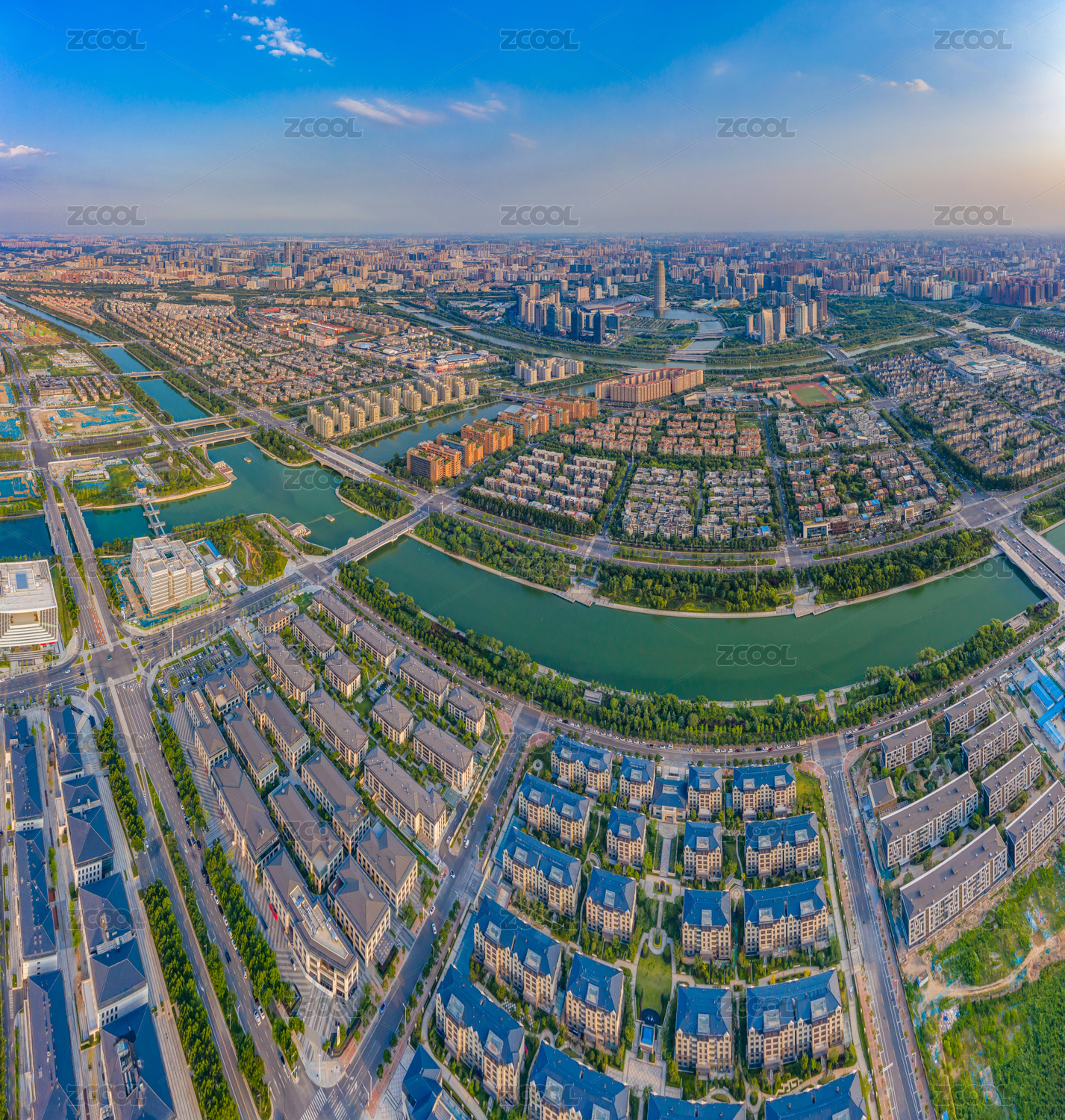 航拍河南郑州郑东新区城市水系河道水网交错