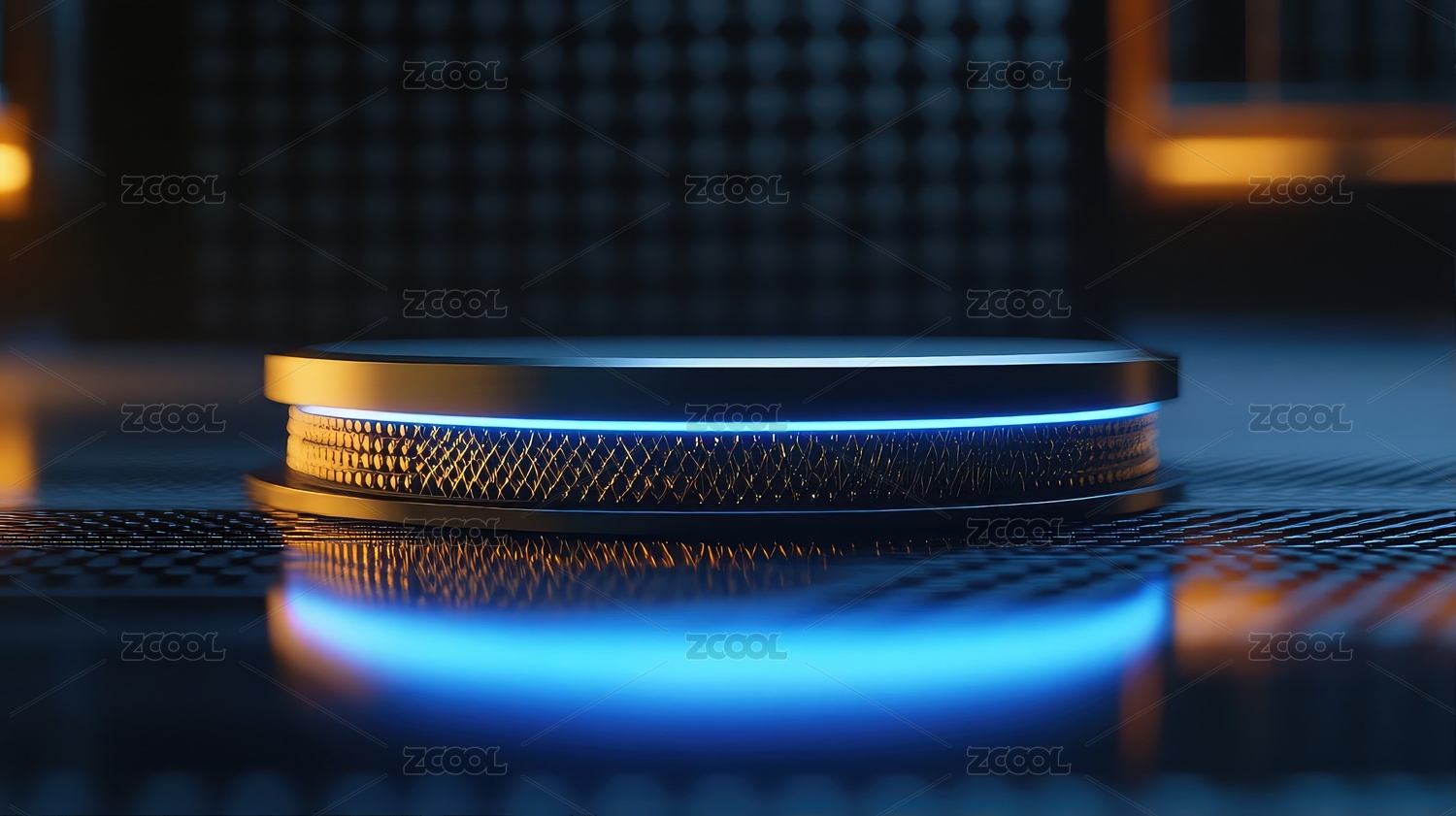 黑色圆形按钮在抽象电路板背景上闪烁蓝光