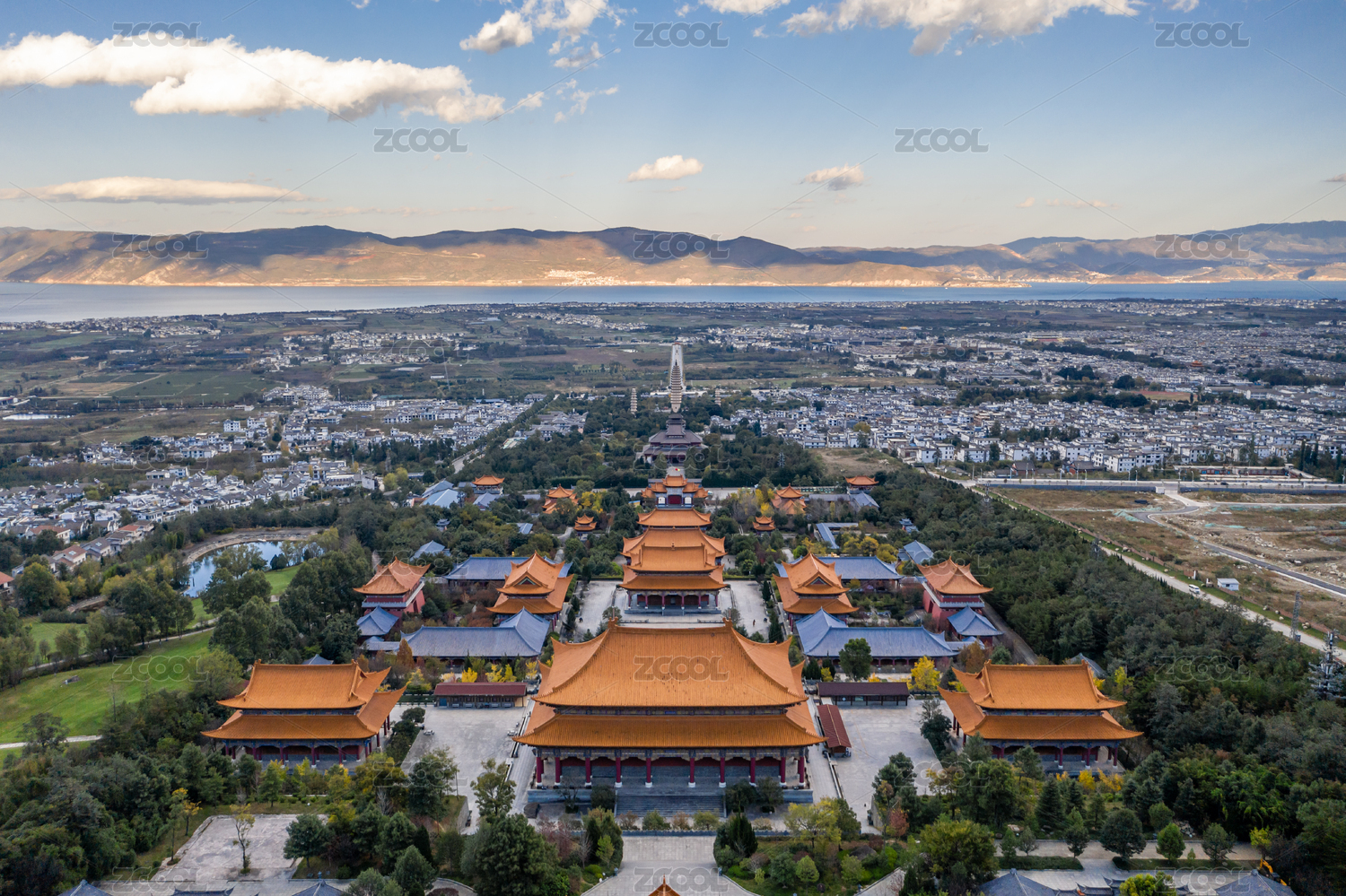 中国云南省大理崇圣寺洱海 三塔日落 航拍