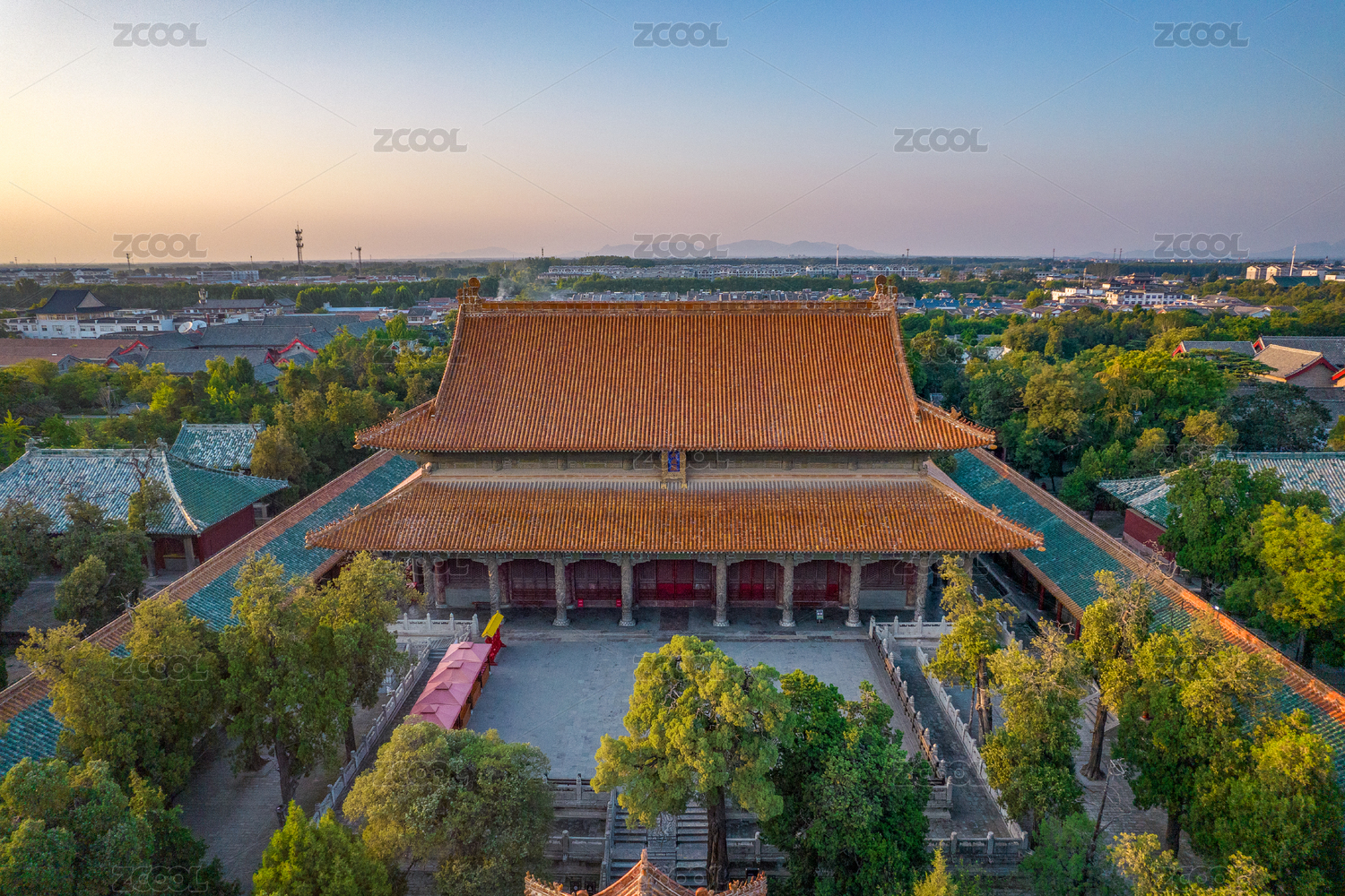 傍晚中国北京中轴线的寿皇殿、鼓楼及其它建筑