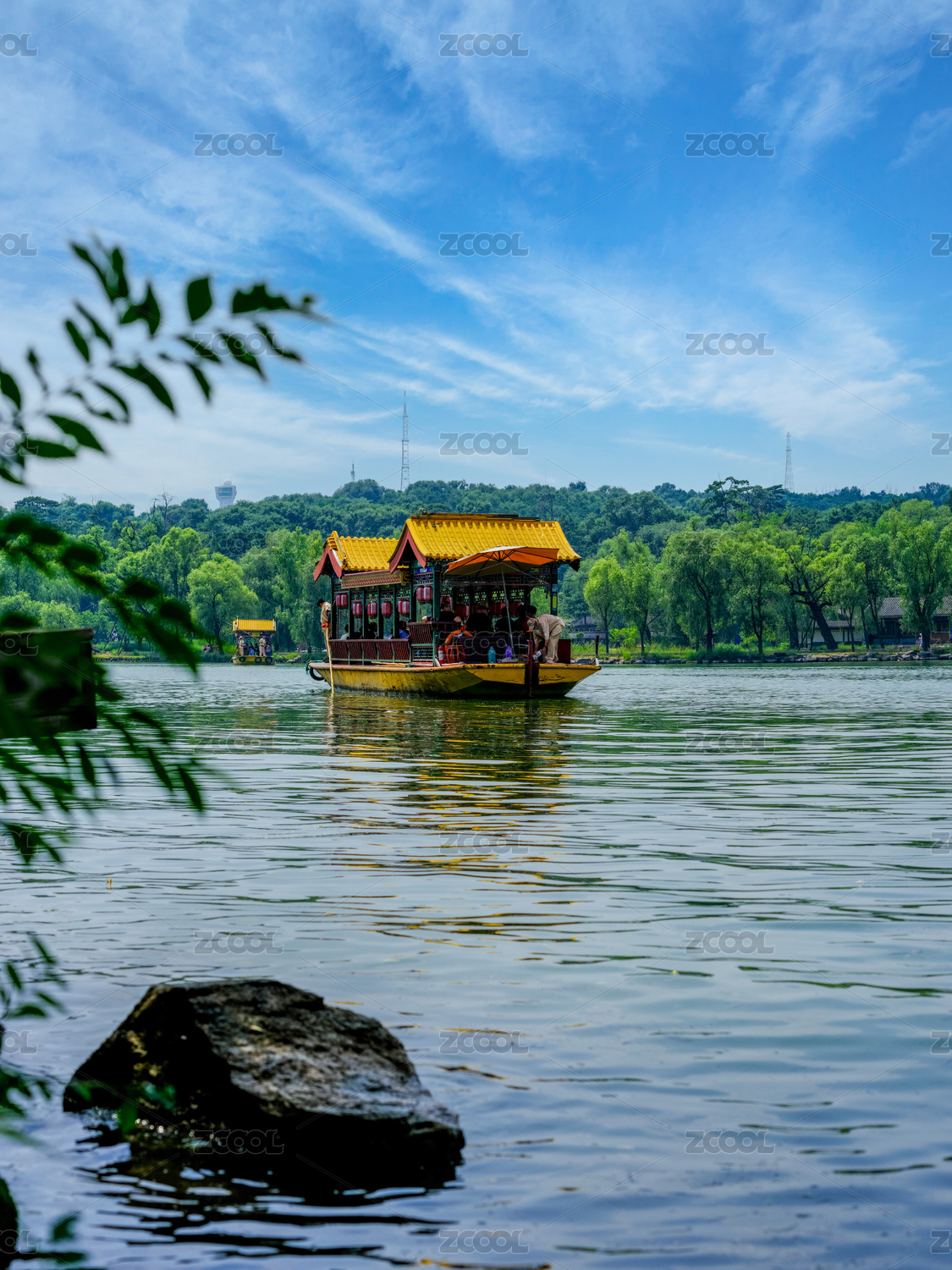 中国浙江杭州西湖,蓝天白云下西湖山水风光
