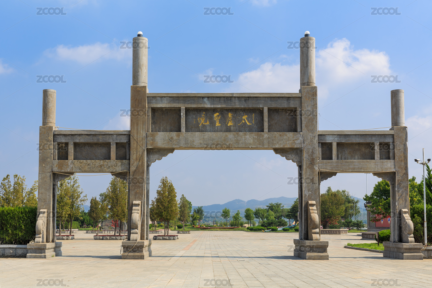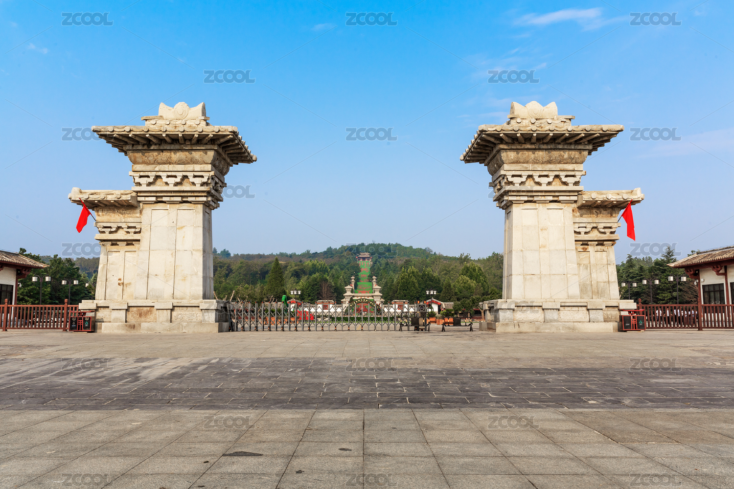 山东临沂云蒙山广场上的中国古建筑长廊和立着