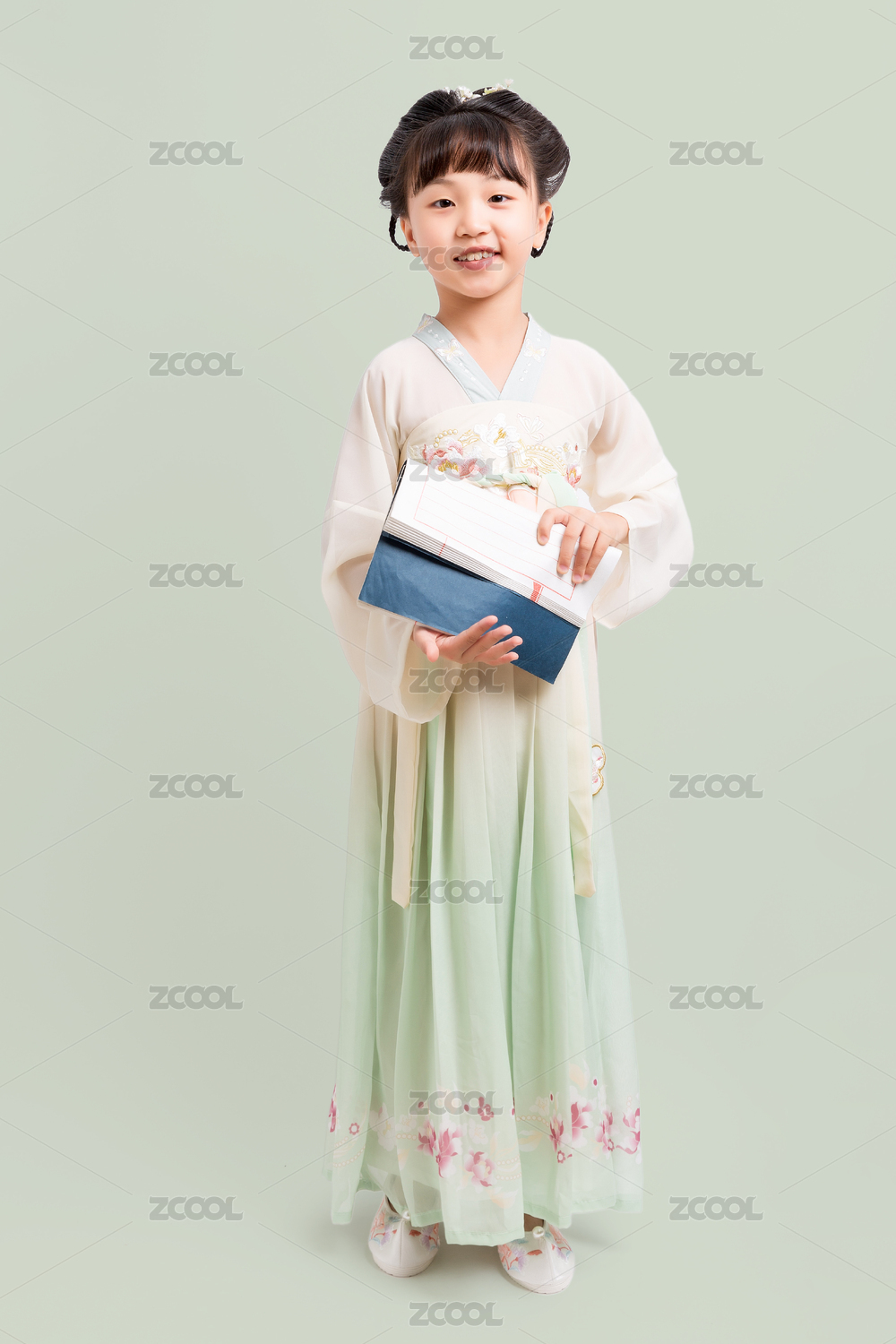 身穿中国古典唐装手拿古书的小女孩棚拍肖像