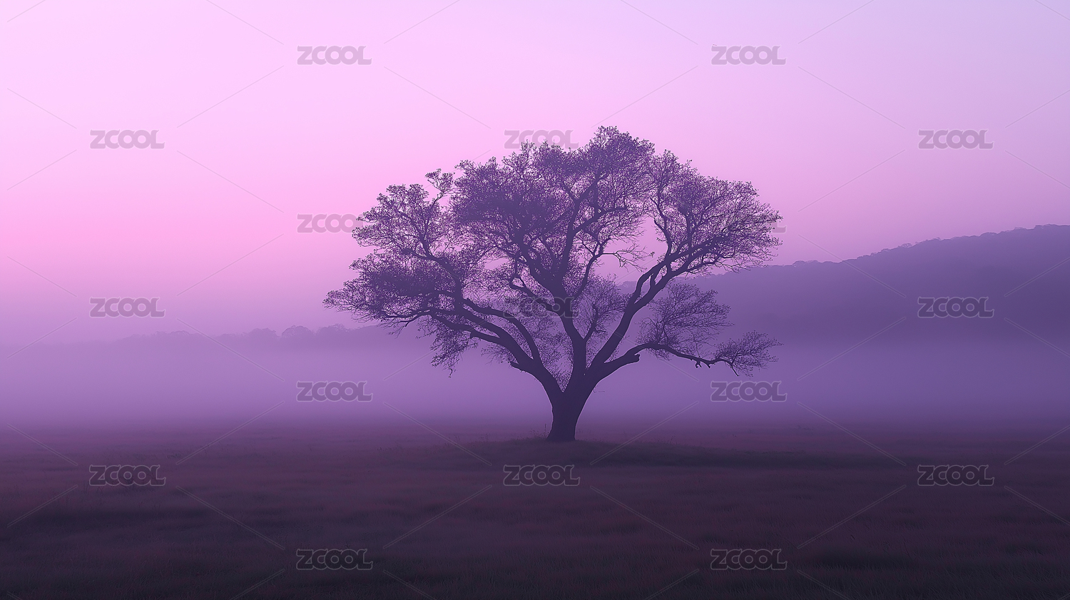 孤树,晨雾,田野,紫色天空,日出,宁静,神秘,自然风光,季节变化,乡村景色