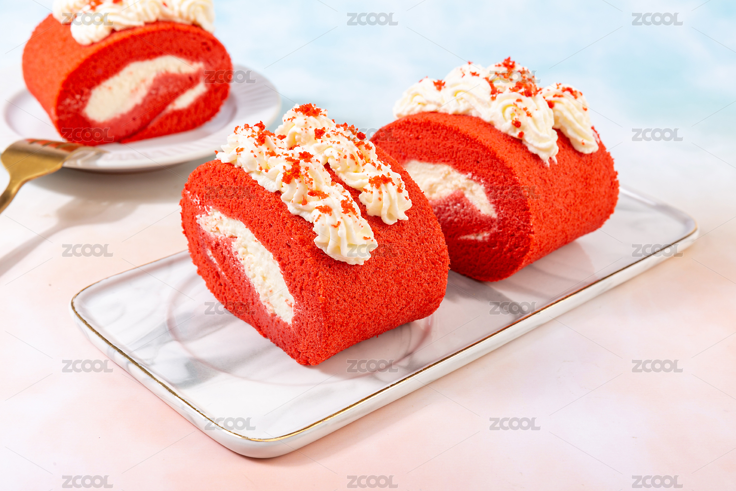 棕色桌面上放着切开的奶油与巧克力酱的蛋卷