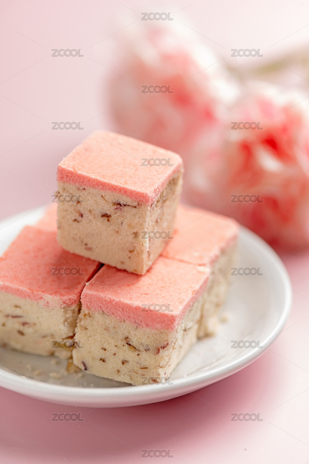特写一盘蛋糕中一个带有心形装饰的粉红色蛋糕