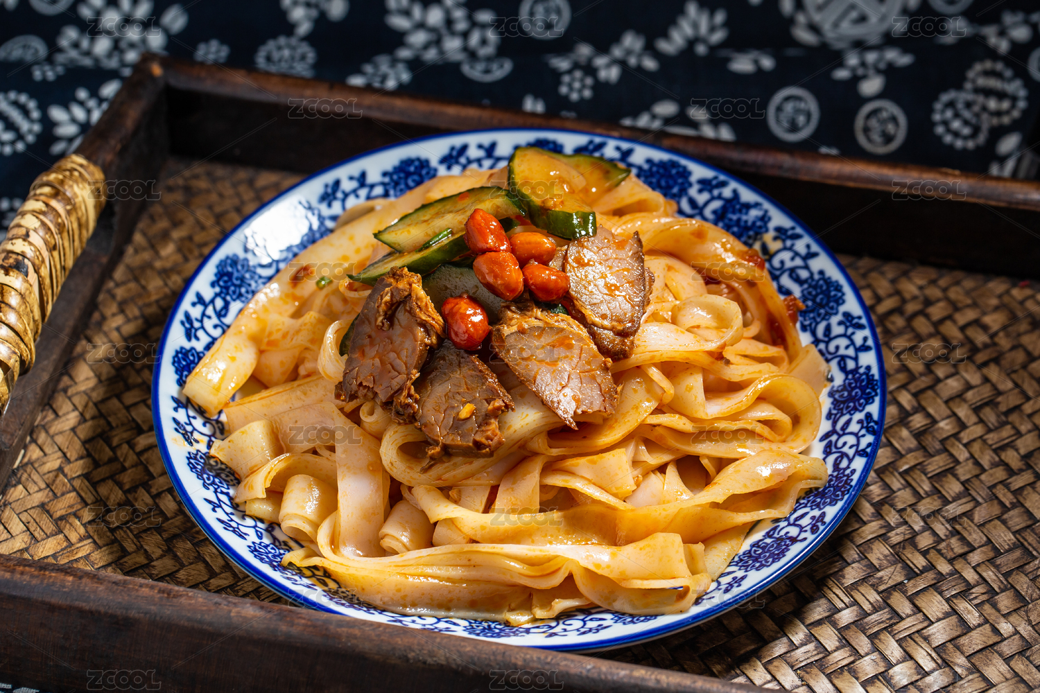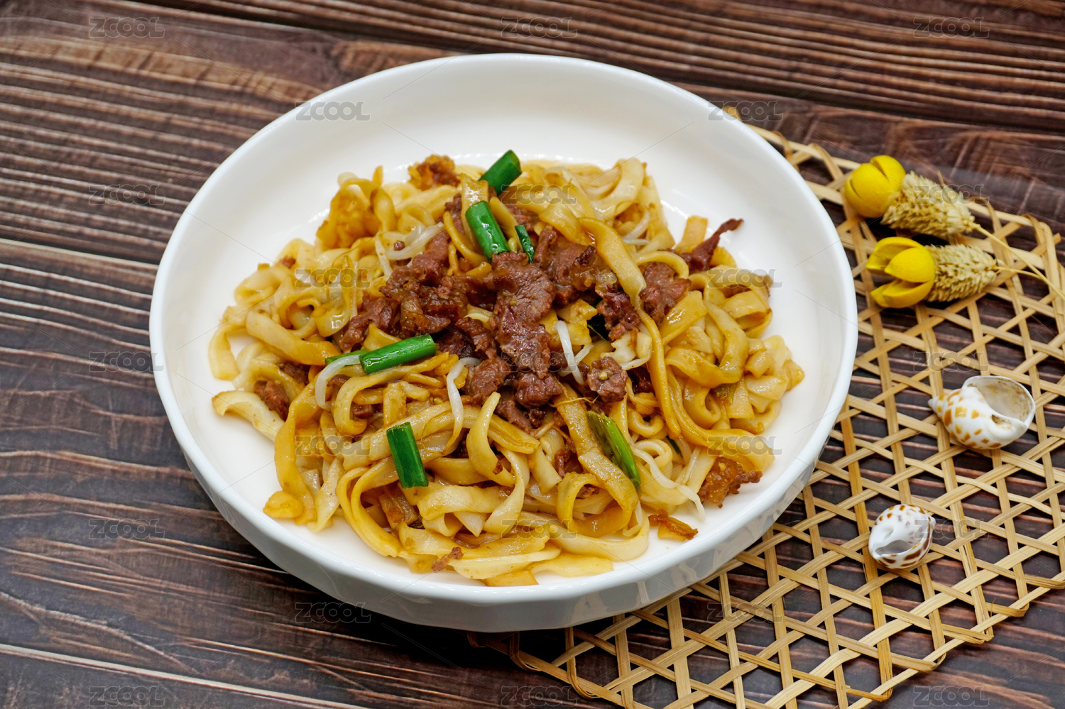 木桌背景一盘粤菜牛肉炒河粉