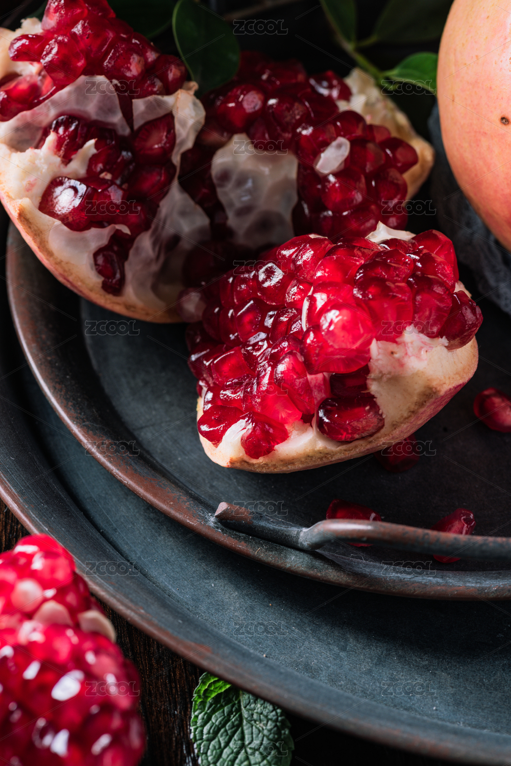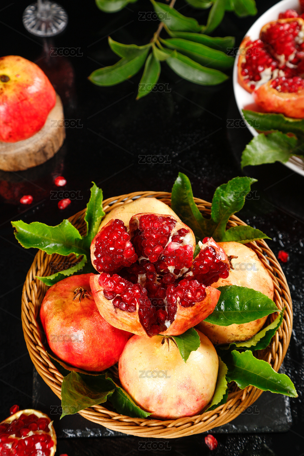 黑底上放着石榴和剥开的红珍珠石榴