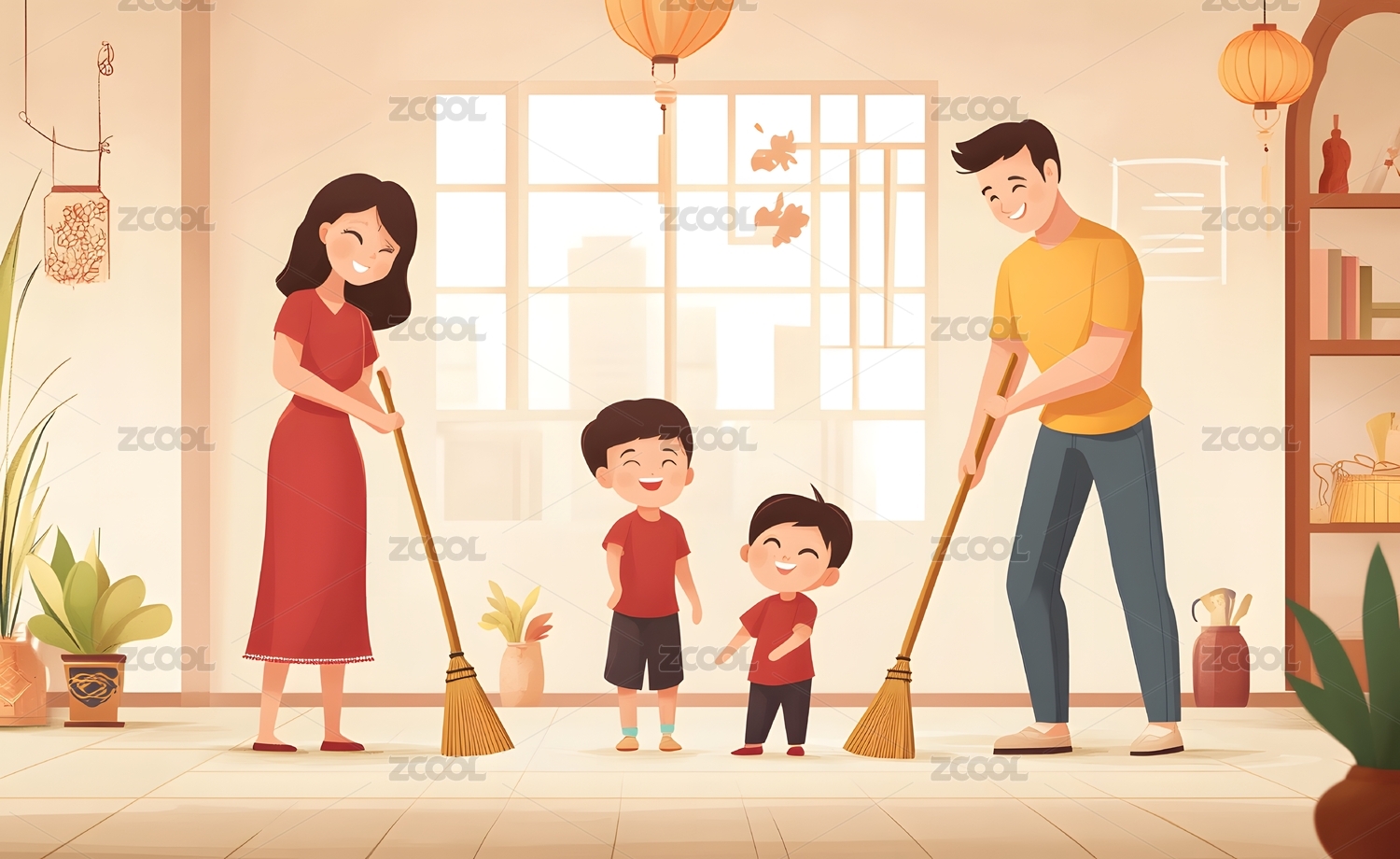 家庭春节大扫除矢量插画