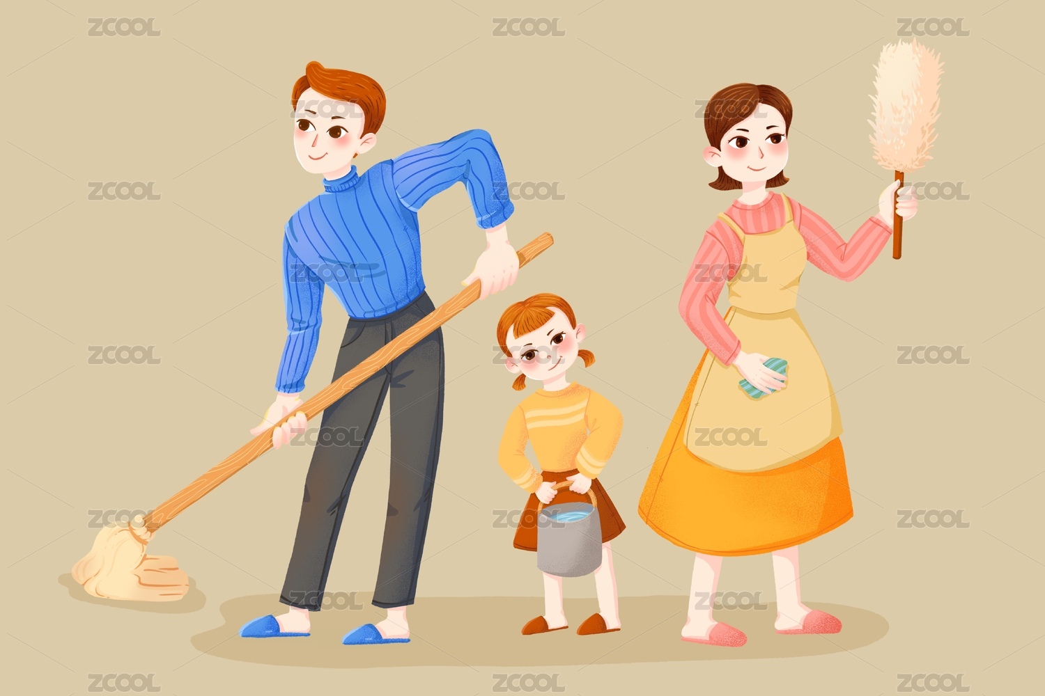 一家三口过年大扫除全身手绘插画图