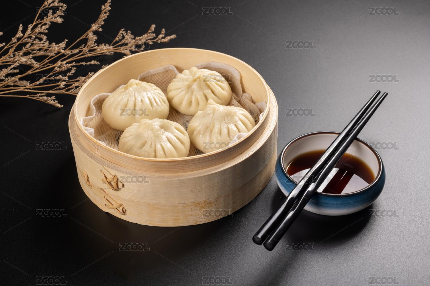 包子,面食,蒸笼,蒸熟,黑背景,醋碟,筷子,蓝印花布