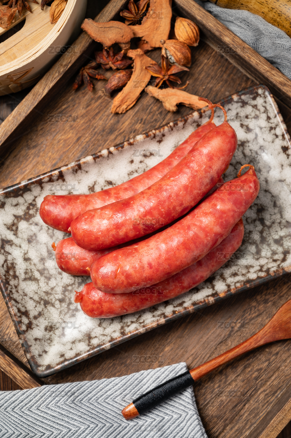 木板上的咸香里脊精肉红香肠