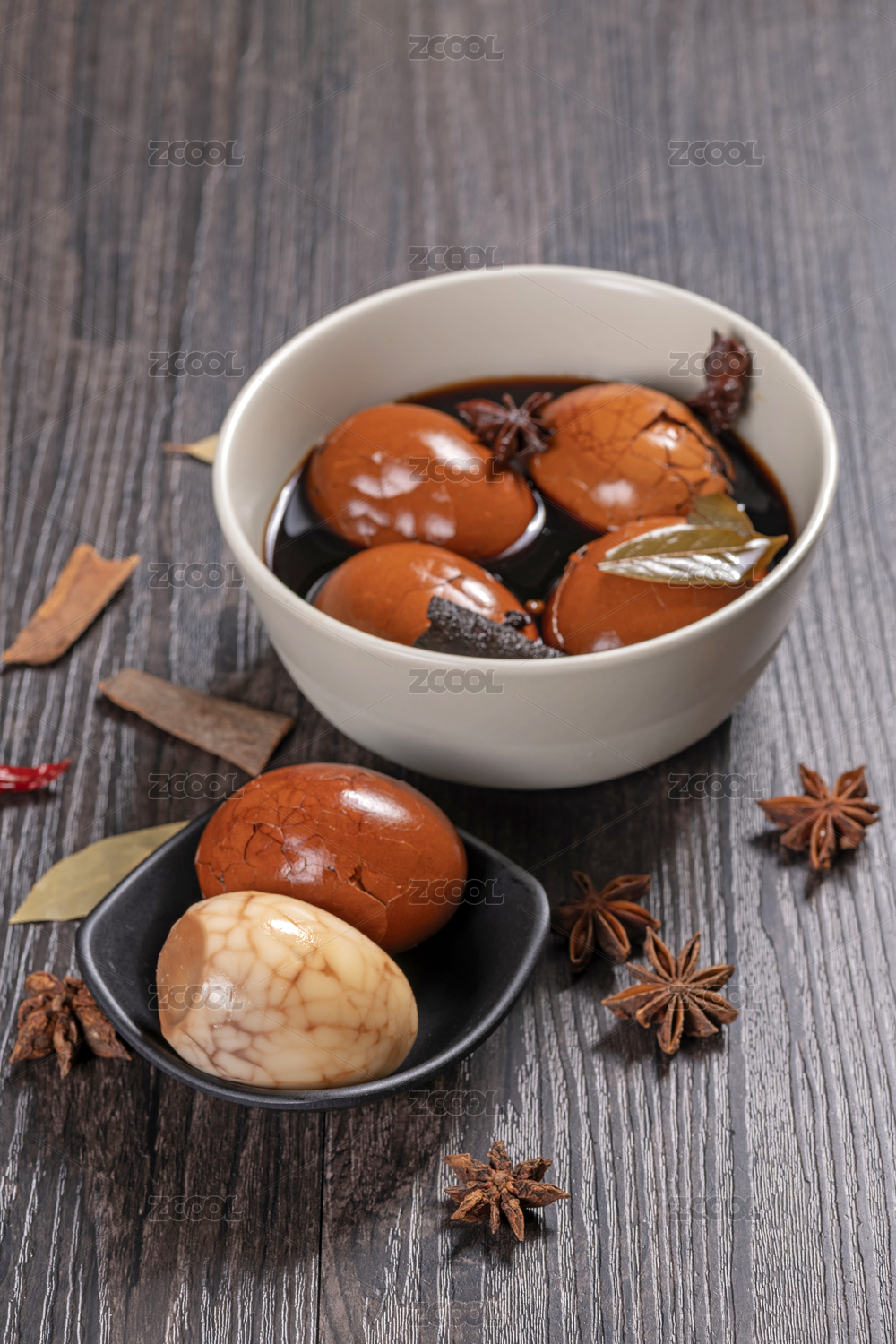 煮熟的茶叶蛋盛放在碟子和碗中摆放在桌面上