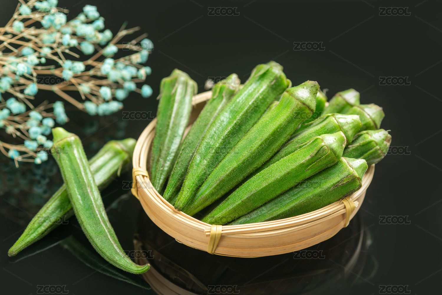 黑底上放着一蓝山东新鲜秋葵