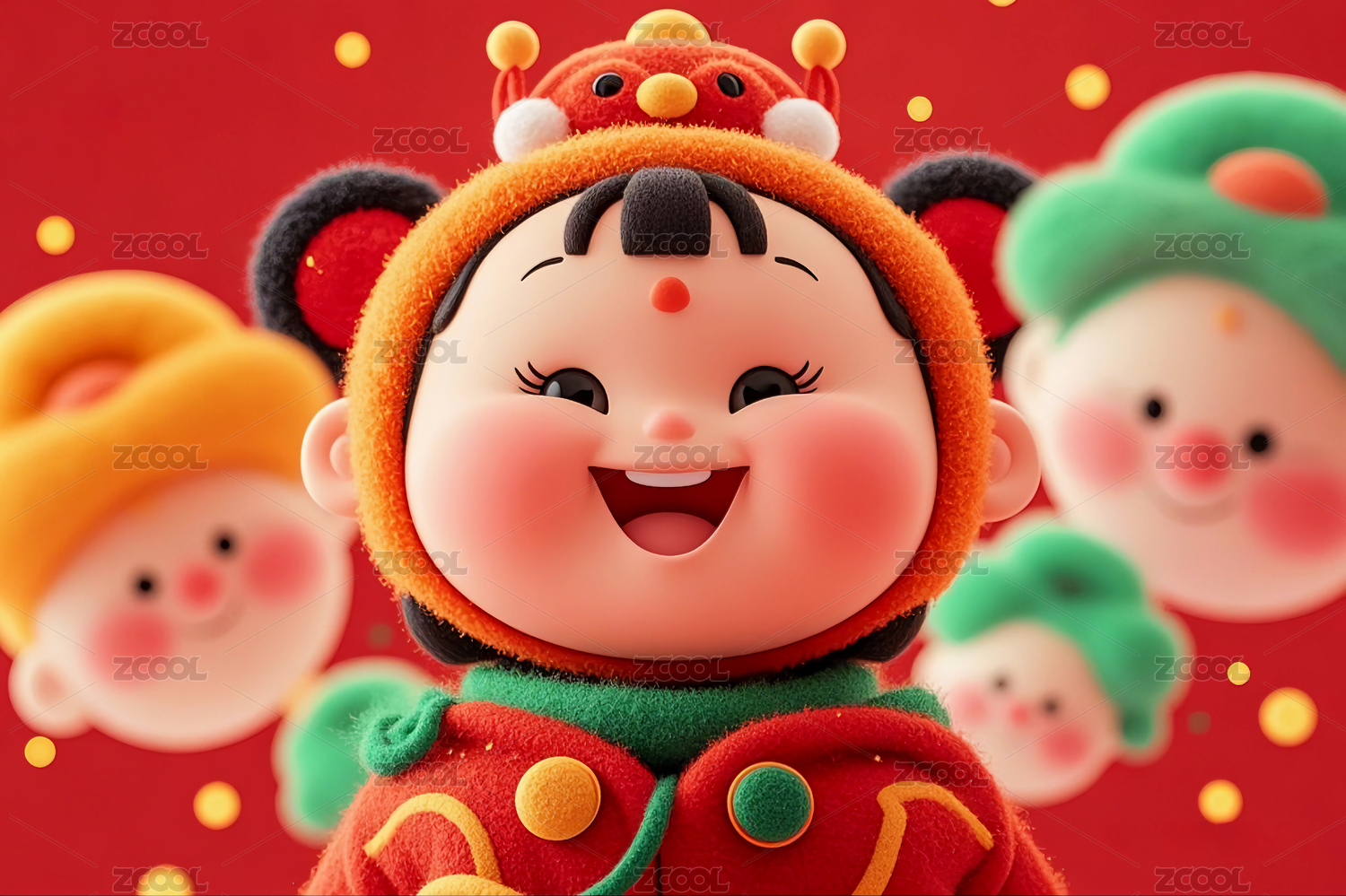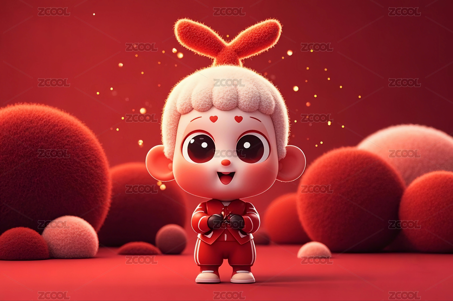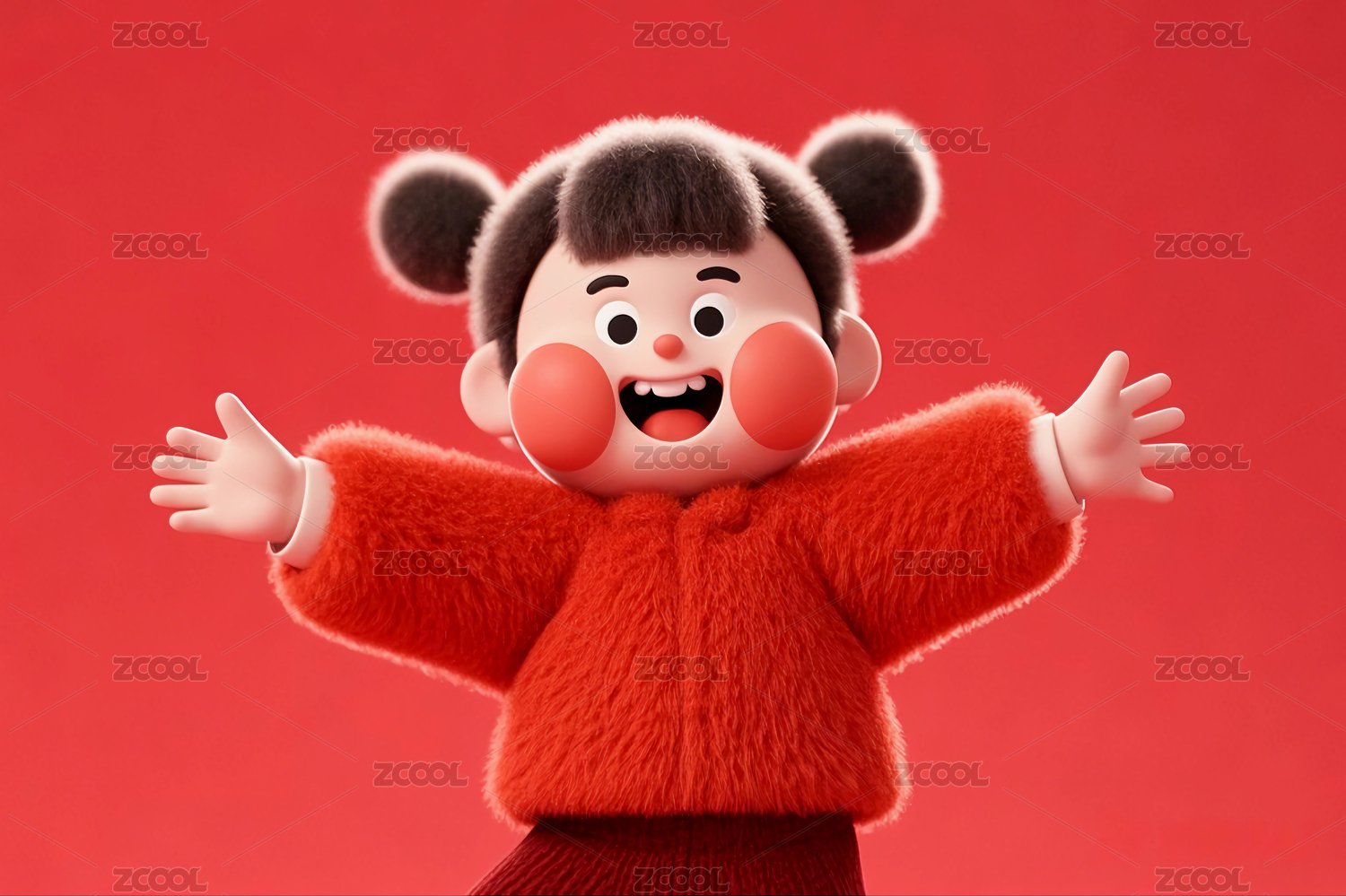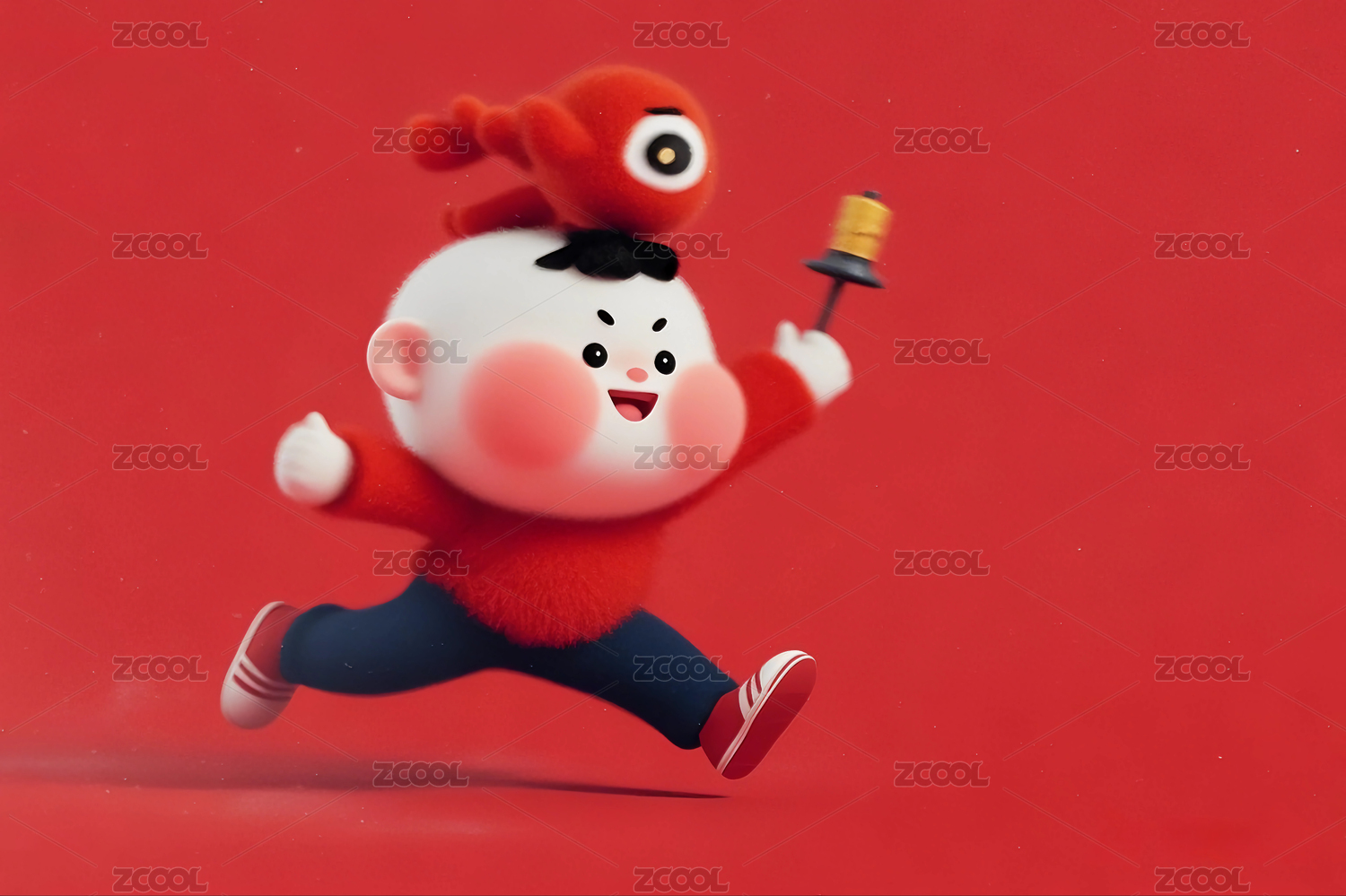 红色背景前喜庆欢度节日的3D卡通娃娃形象