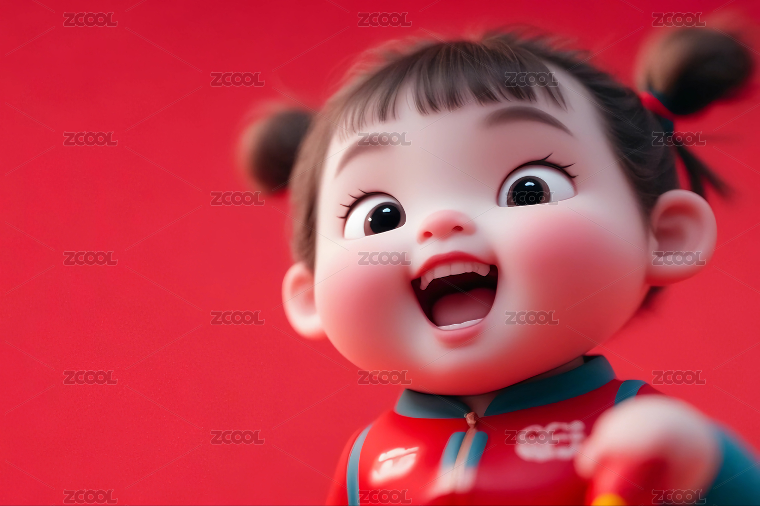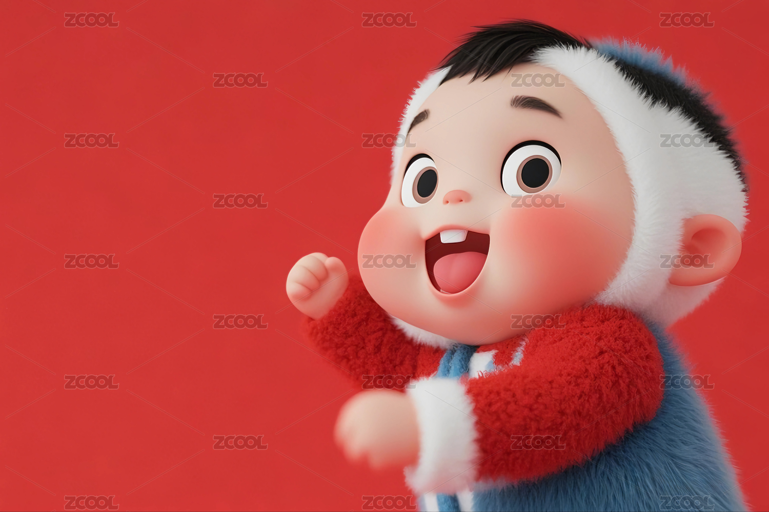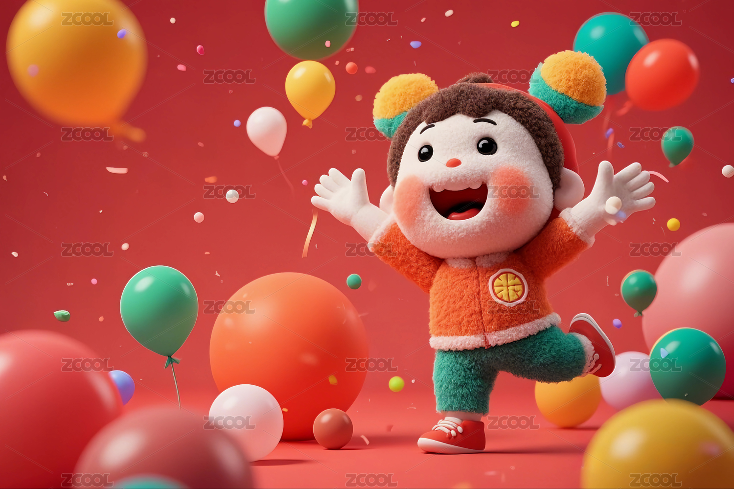 红色背景前喜庆欢度节日的3D卡通娃娃形象