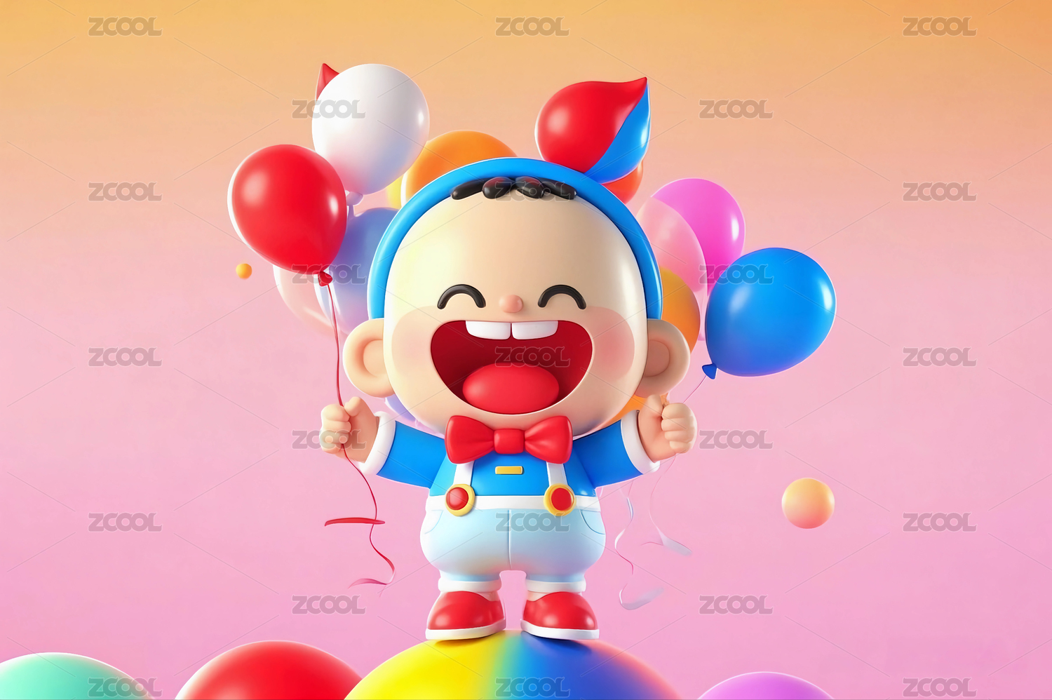 3D拿着气球庆祝节日的卡通可爱男孩