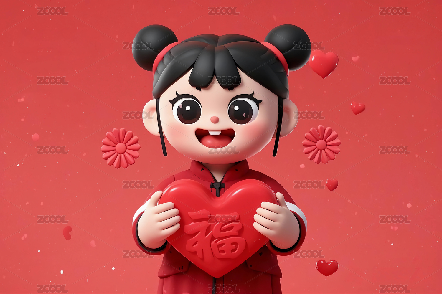 3D拿着爱心福字的卡通儿童女孩
