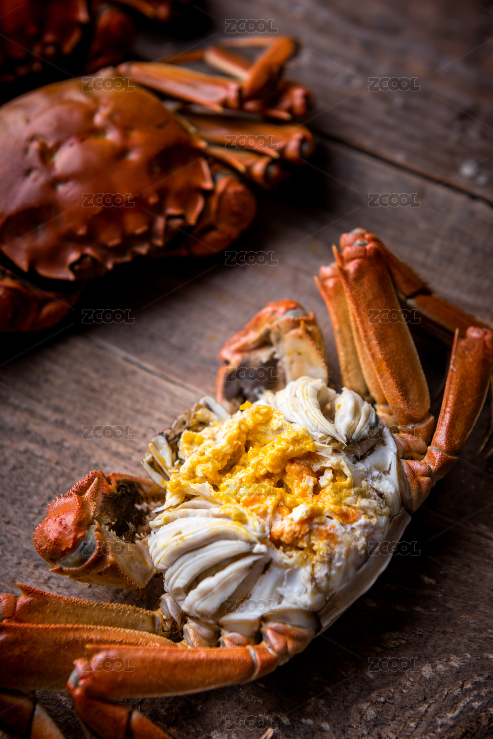 木纹背景上摆放熟的阳澄湖大闸蟹