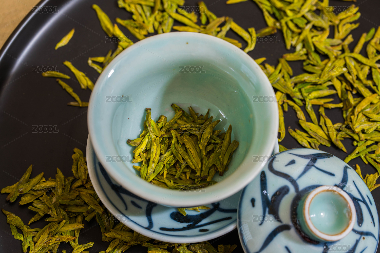 复古盖碗里装有新鲜绿色干茶叶
