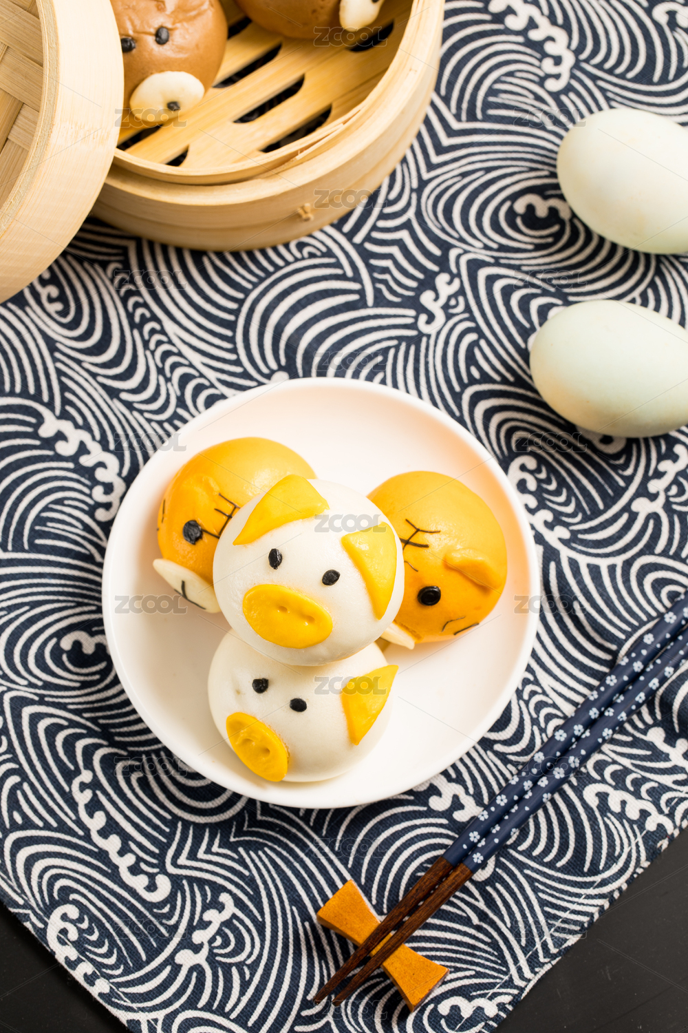 放在竹排上的创意可爱猪生肖创意包子
