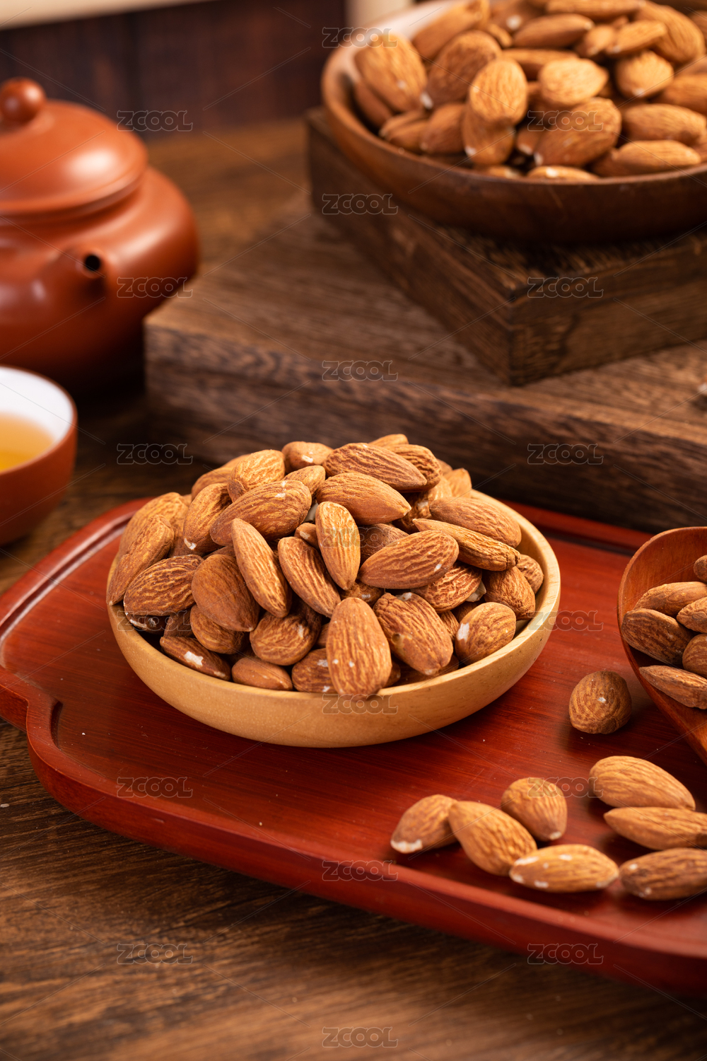 桌子上用木盘装着的杏仁巴旦木坚果