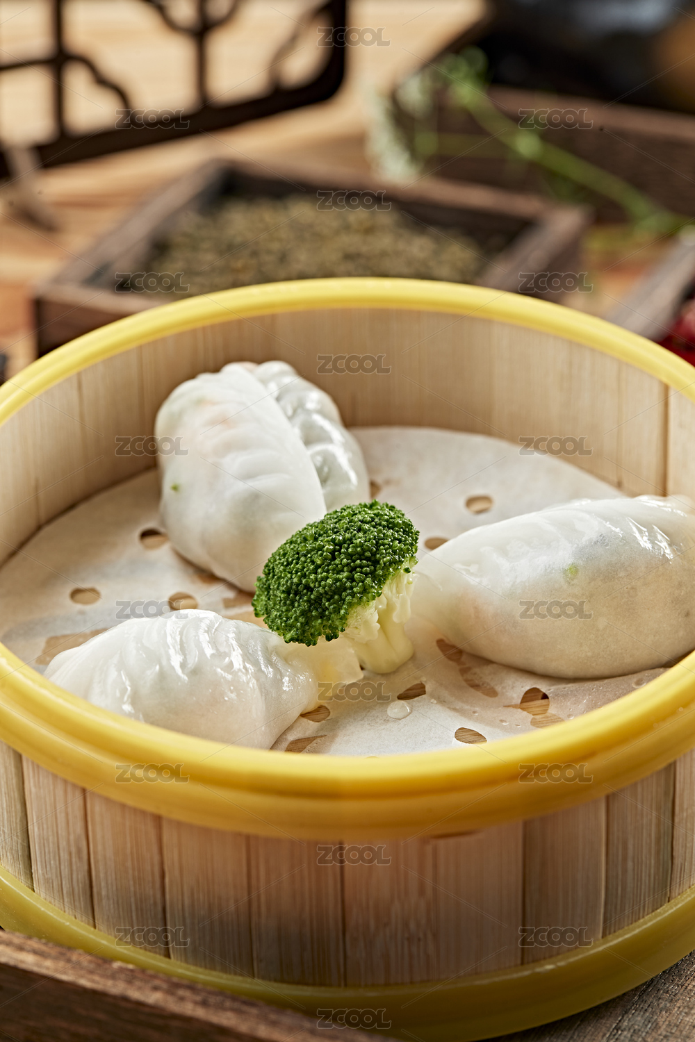 木板背景上满满一蒸笼小笼包