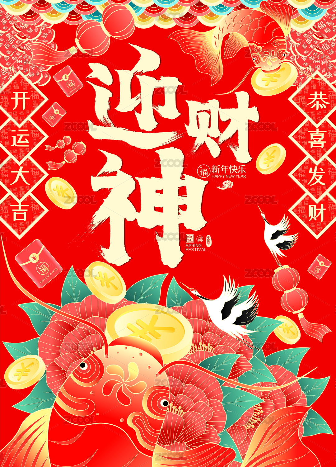 迎财神锦鲤牡丹仙鹤送福开运春节海报
