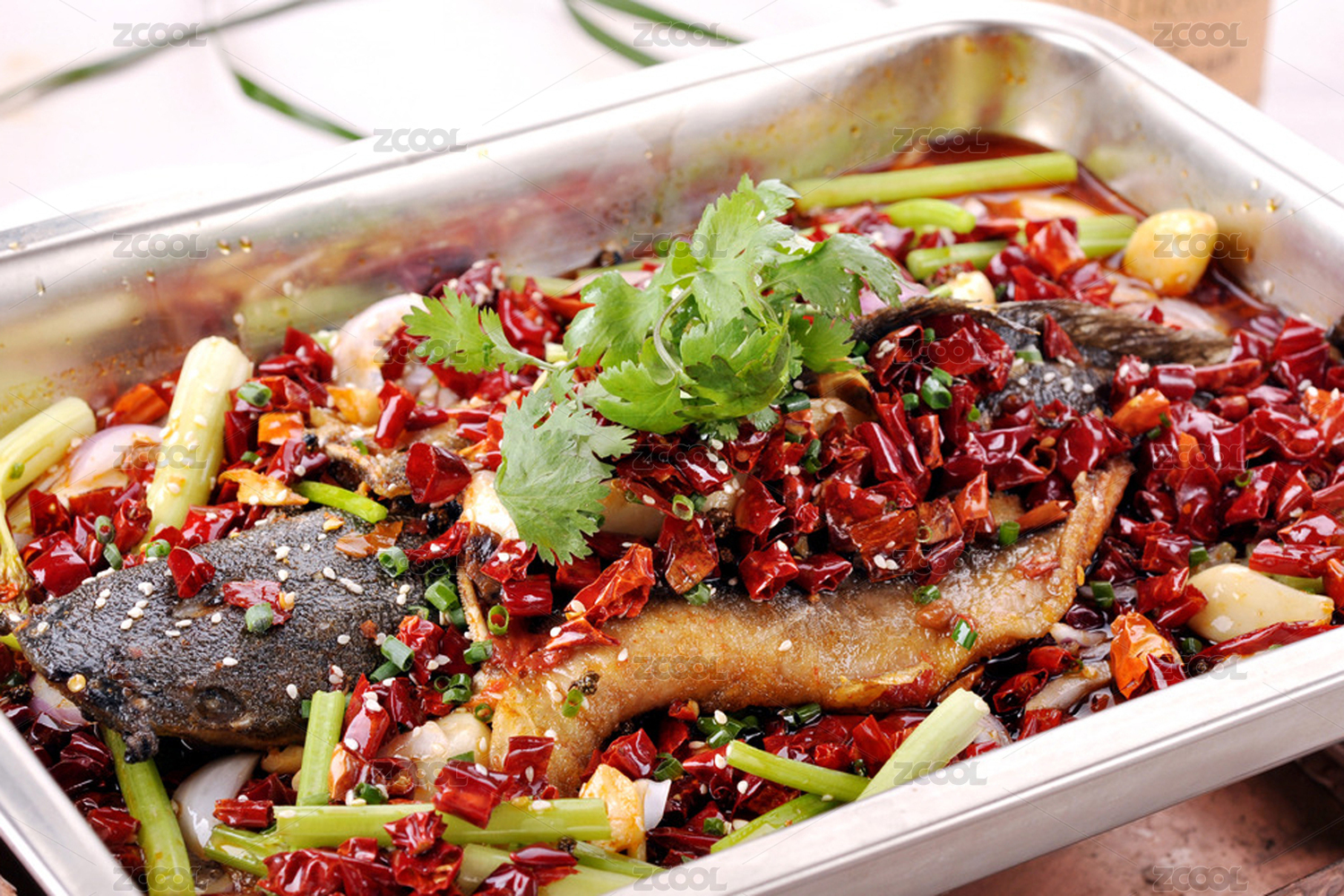 不锈钢长方盘上的麻辣重庆烤鱼