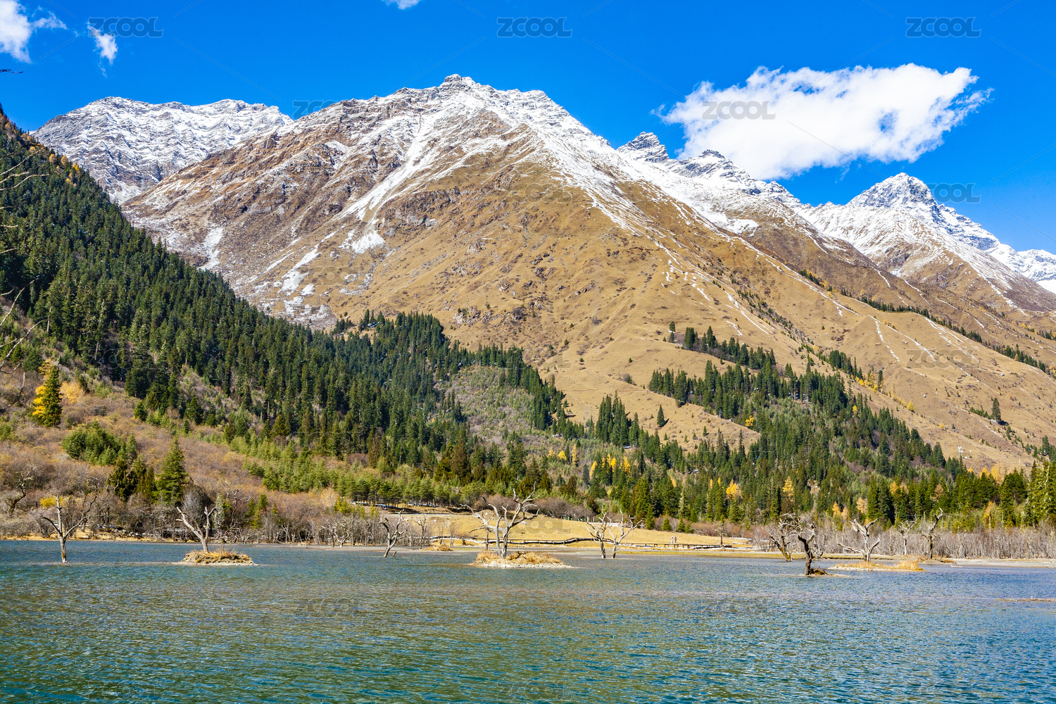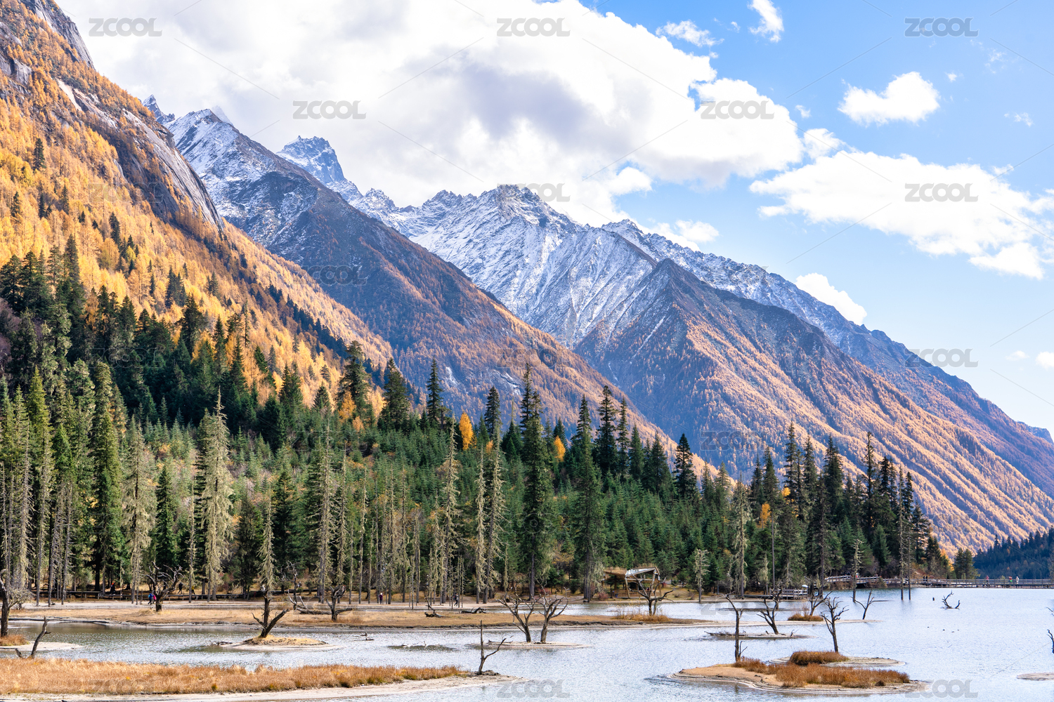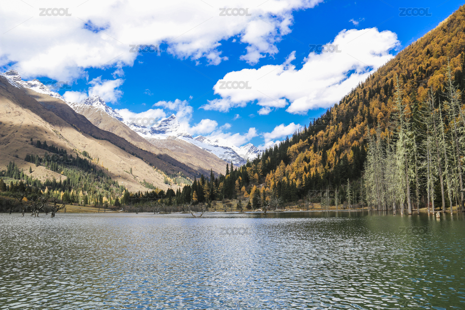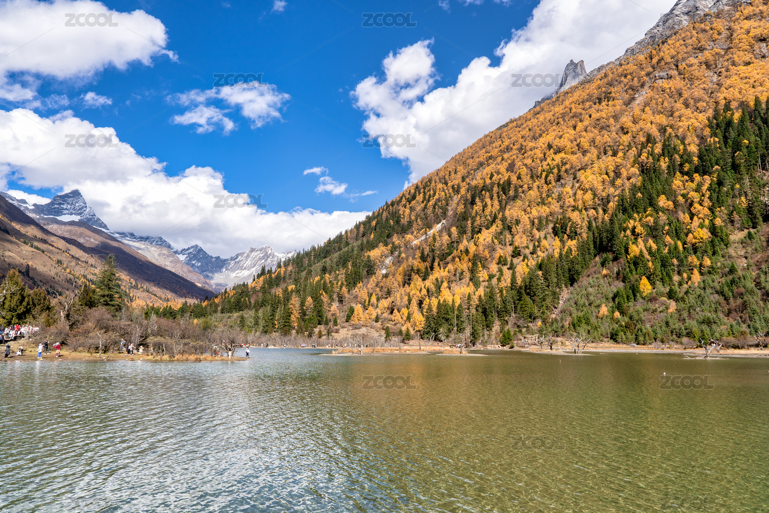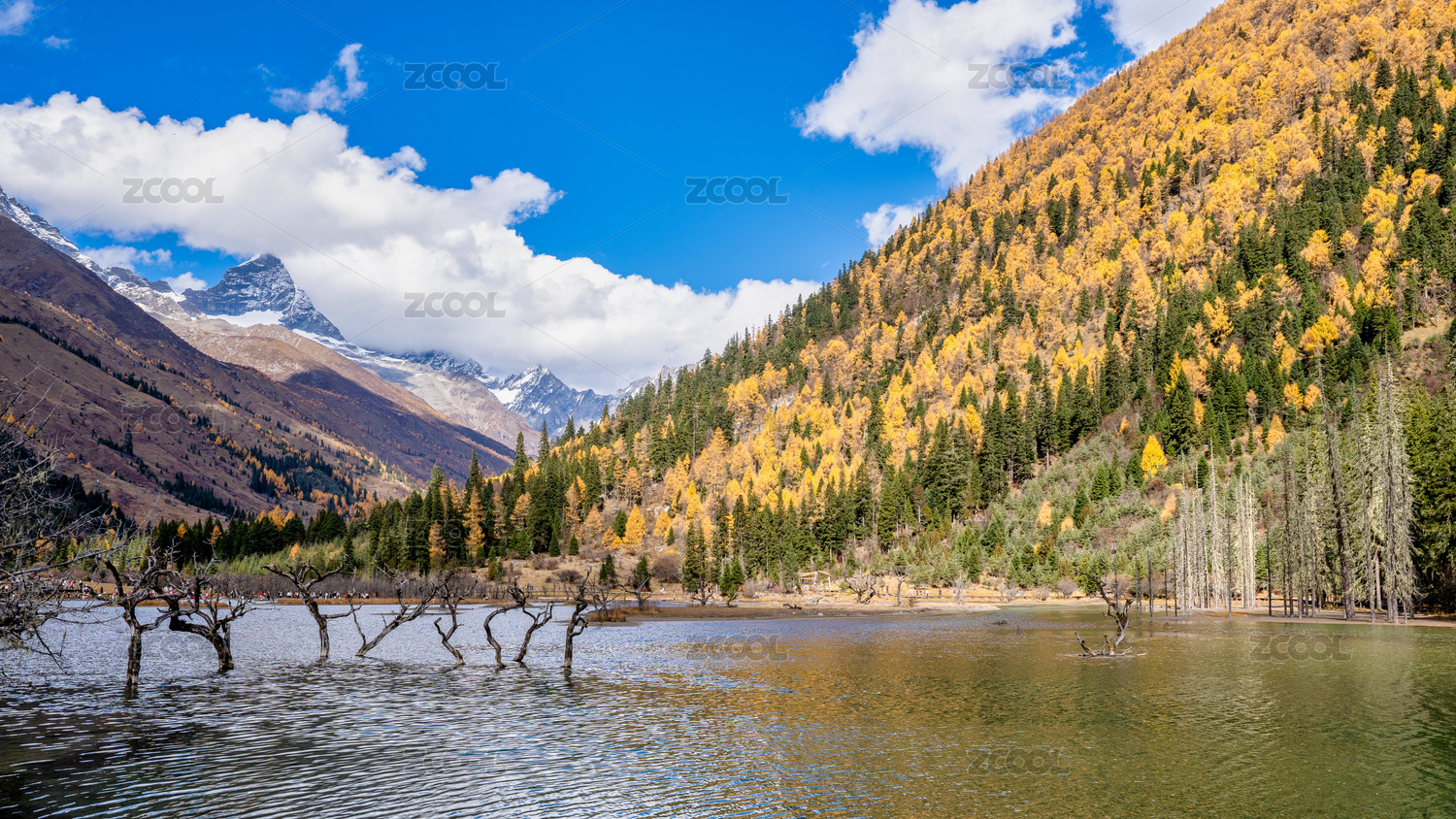 四川省甘孜藏族自治州四姑娘山秋季雪山彩林碧水景观