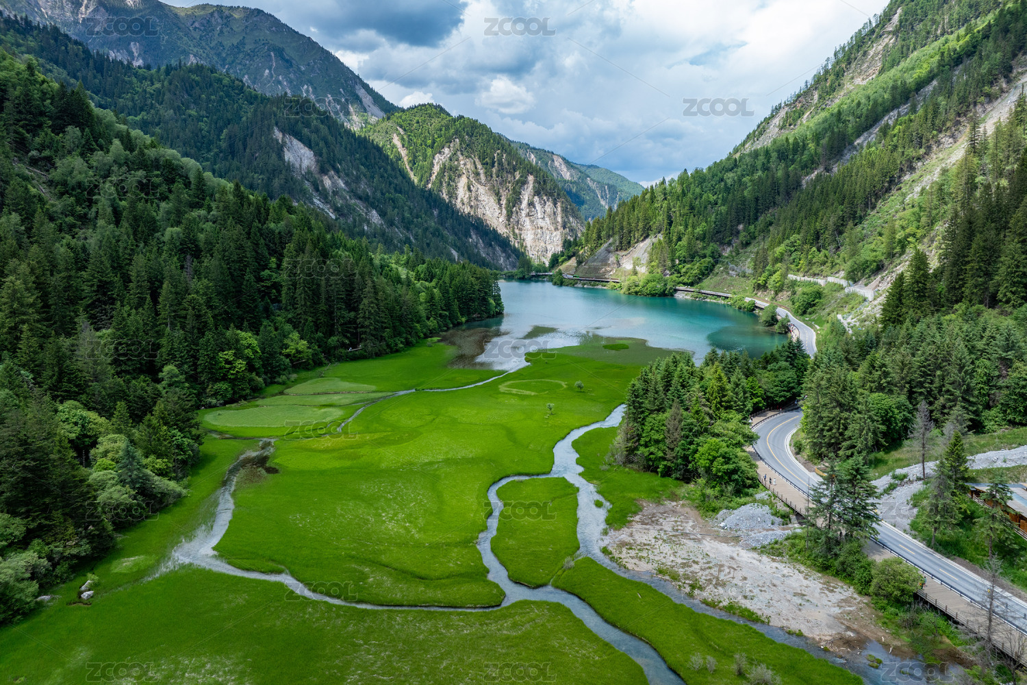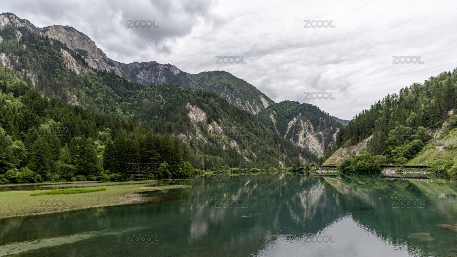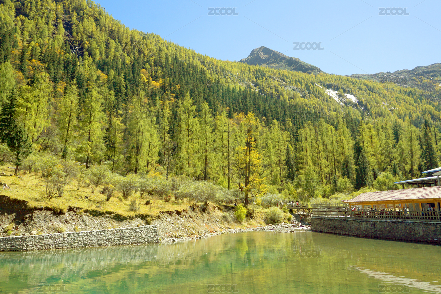 高山下的景区栈道湖泊