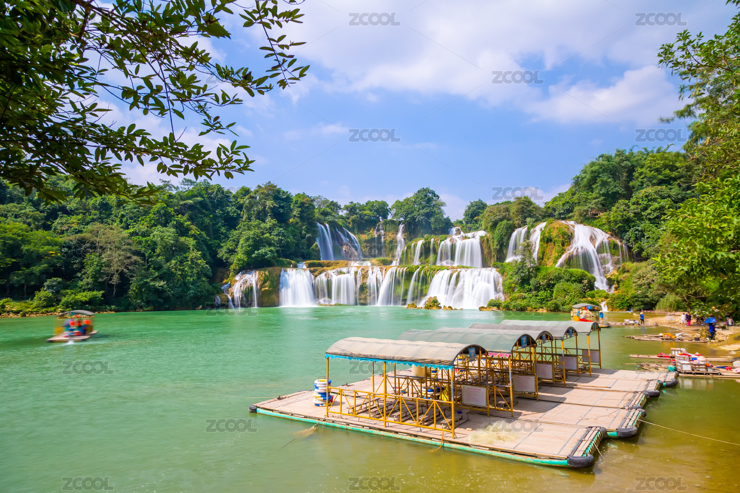 中国,广西,崇左,德天瀑布,美丽中国,蓝天,白云,河流,碧水,小船