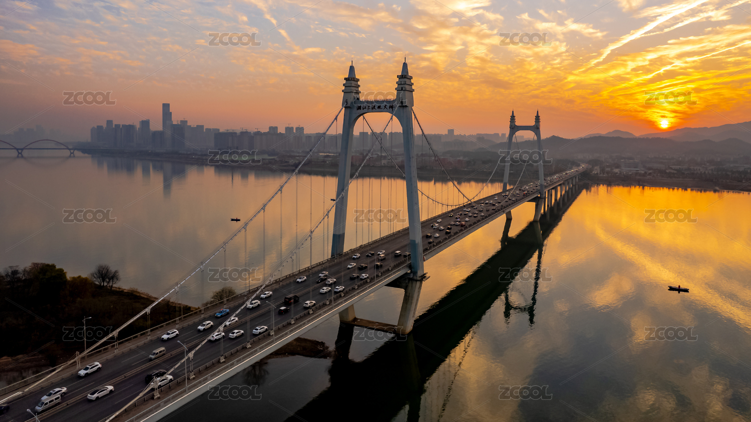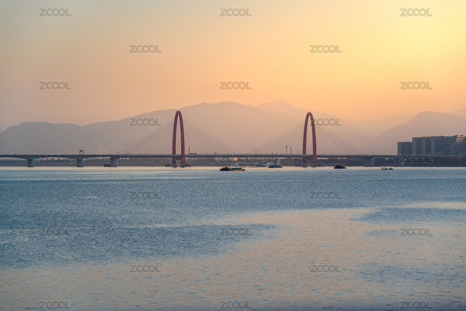 浙江省杭州富阳富春大桥富春江晨曦航拍