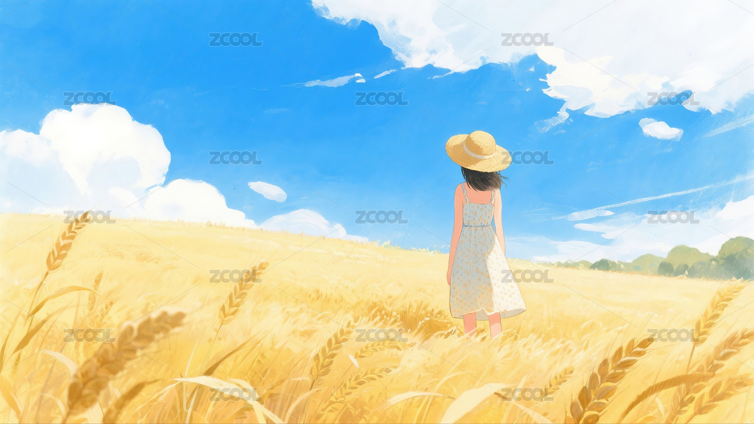 可爱的小女孩抱着麦穗在金黄的麦田里大笑
