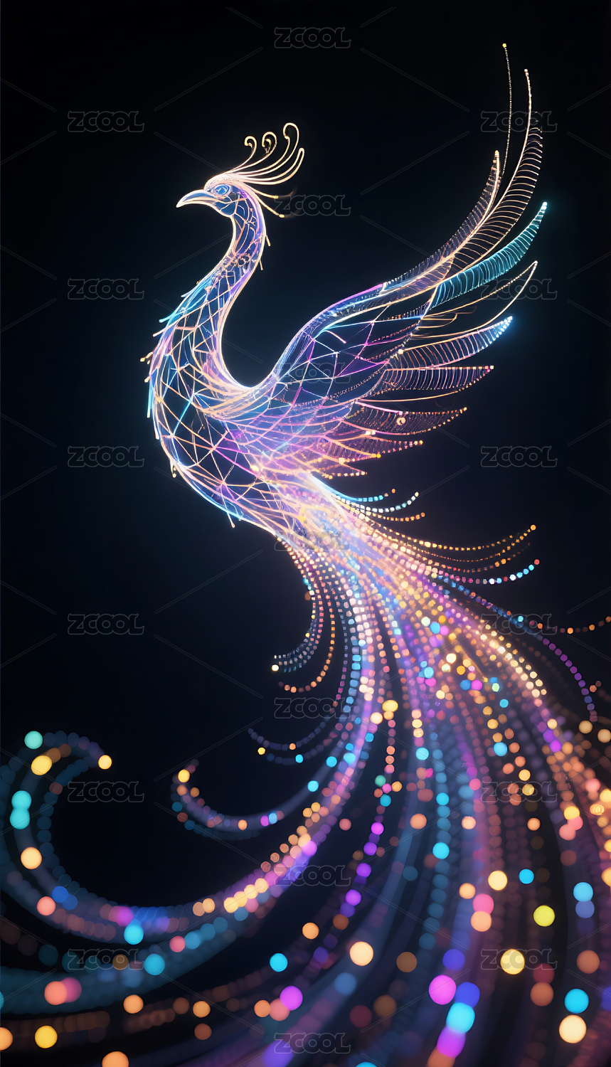 奇幻神话黑背景夜空展翅飞翔的发光神鸟插画