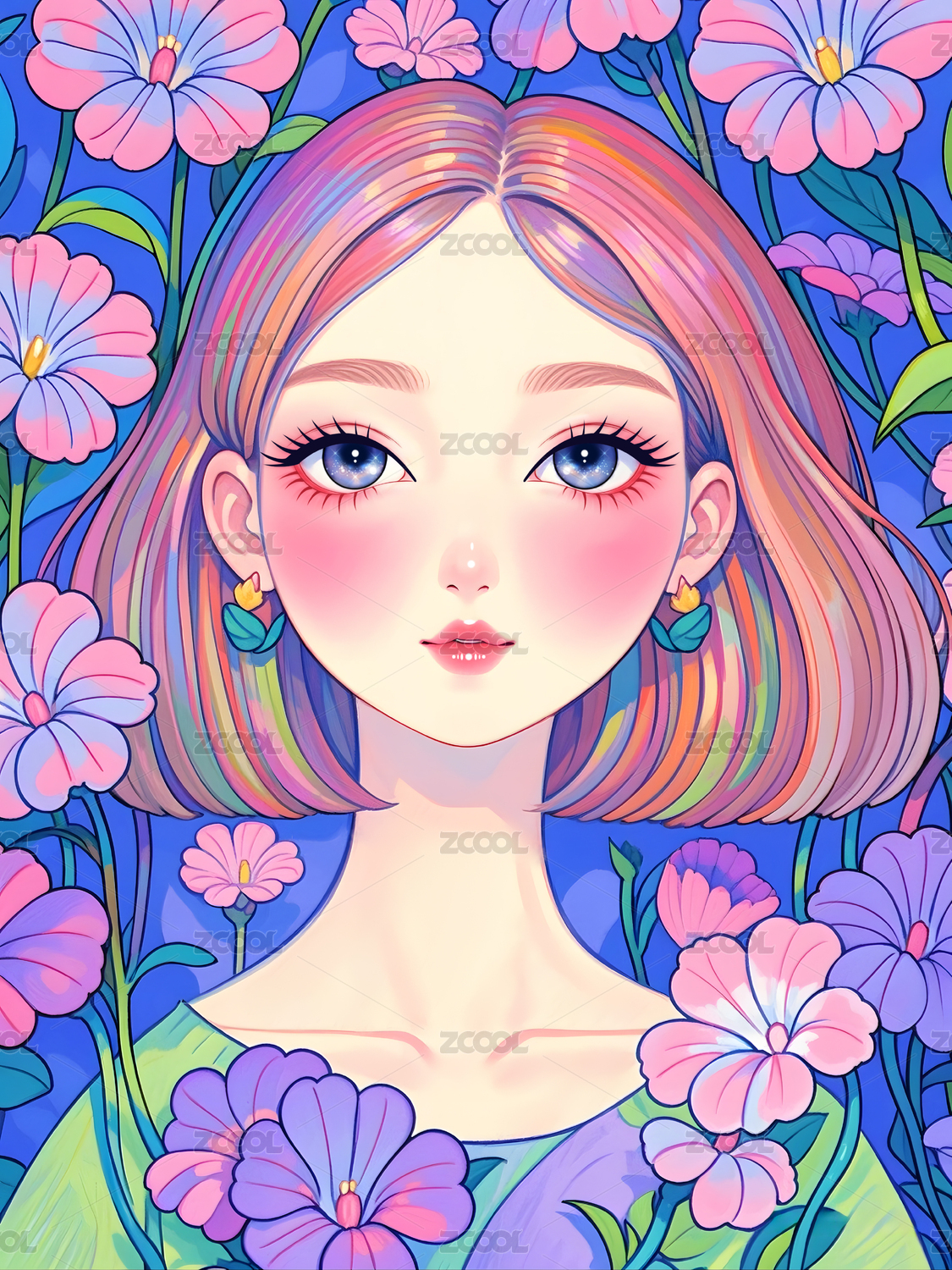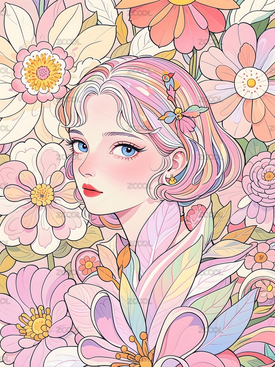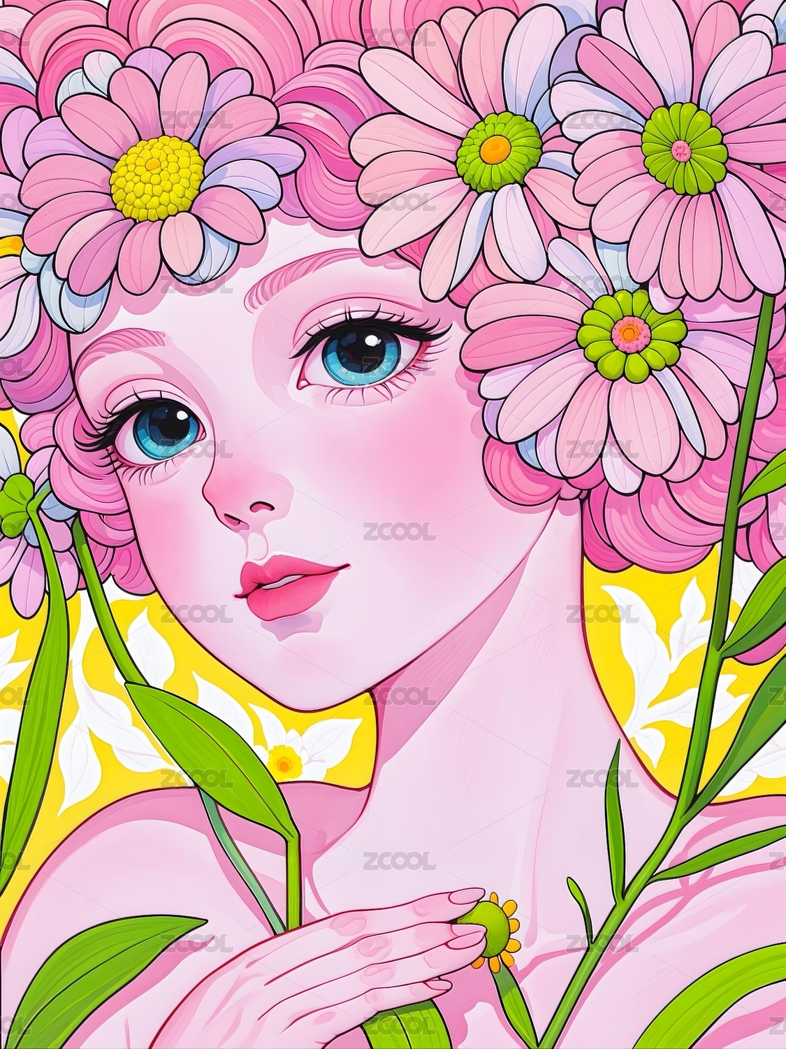 少女,花朵,花海,梦幻,水彩,插画,唯美,清新,绘画,艺术