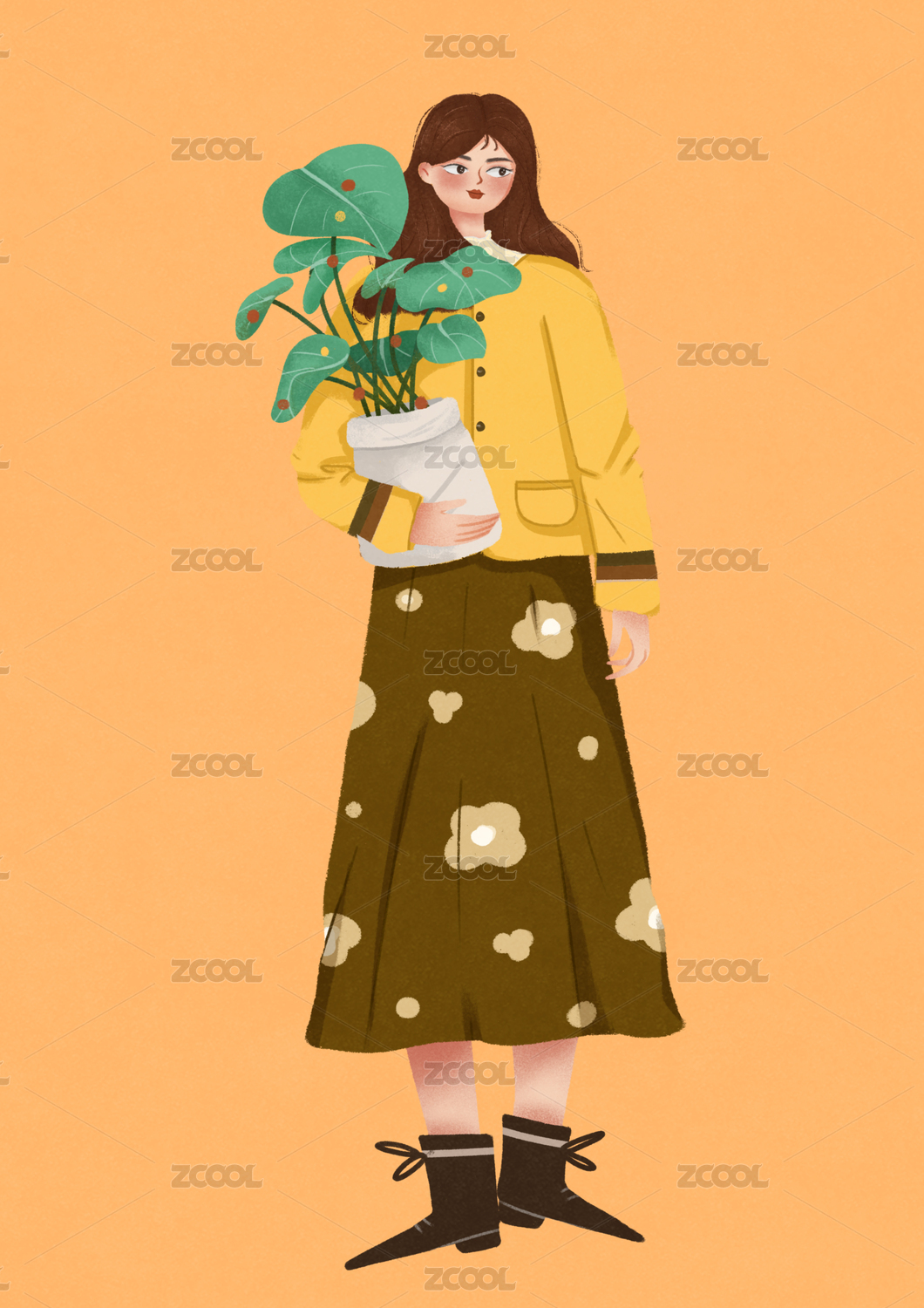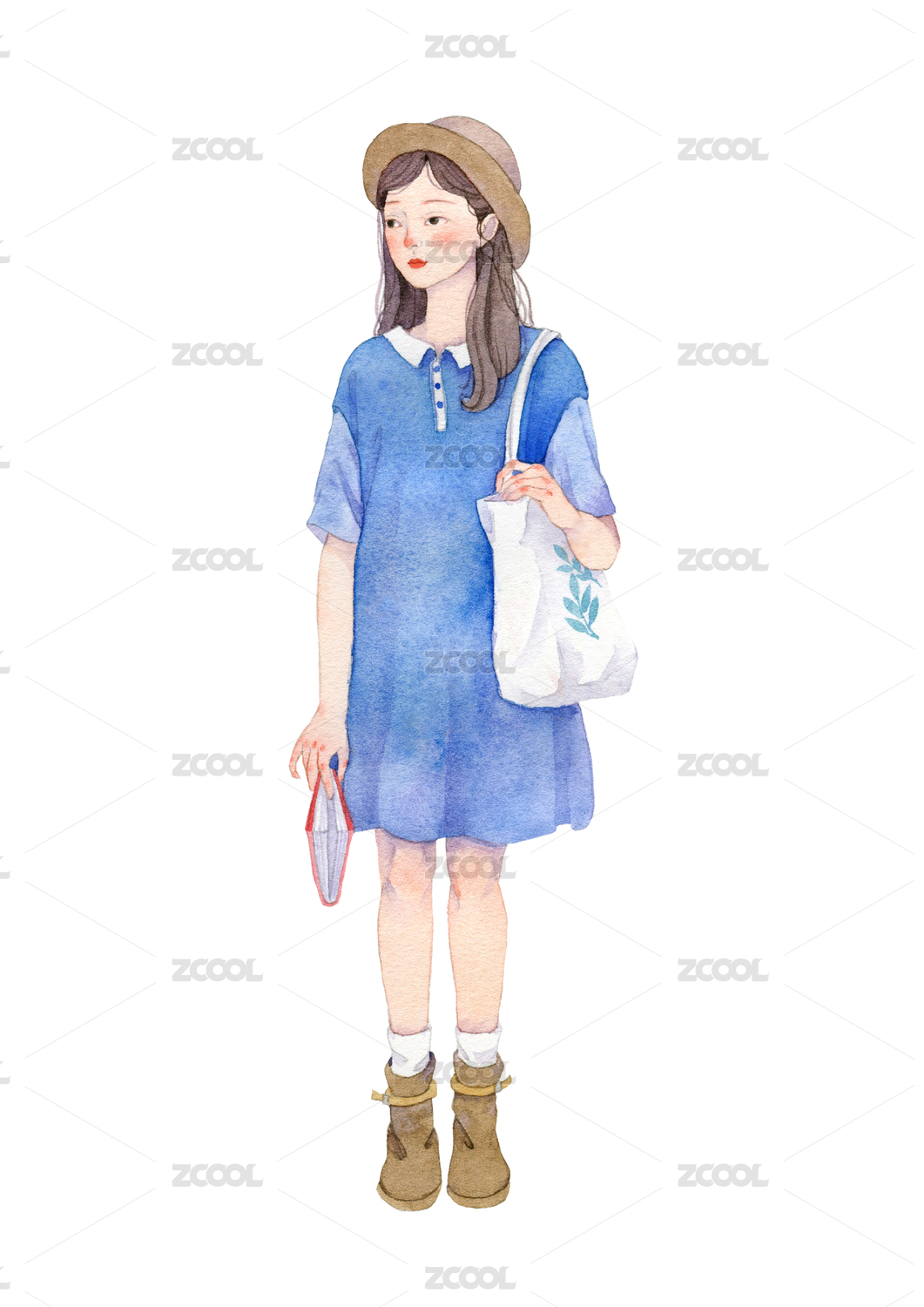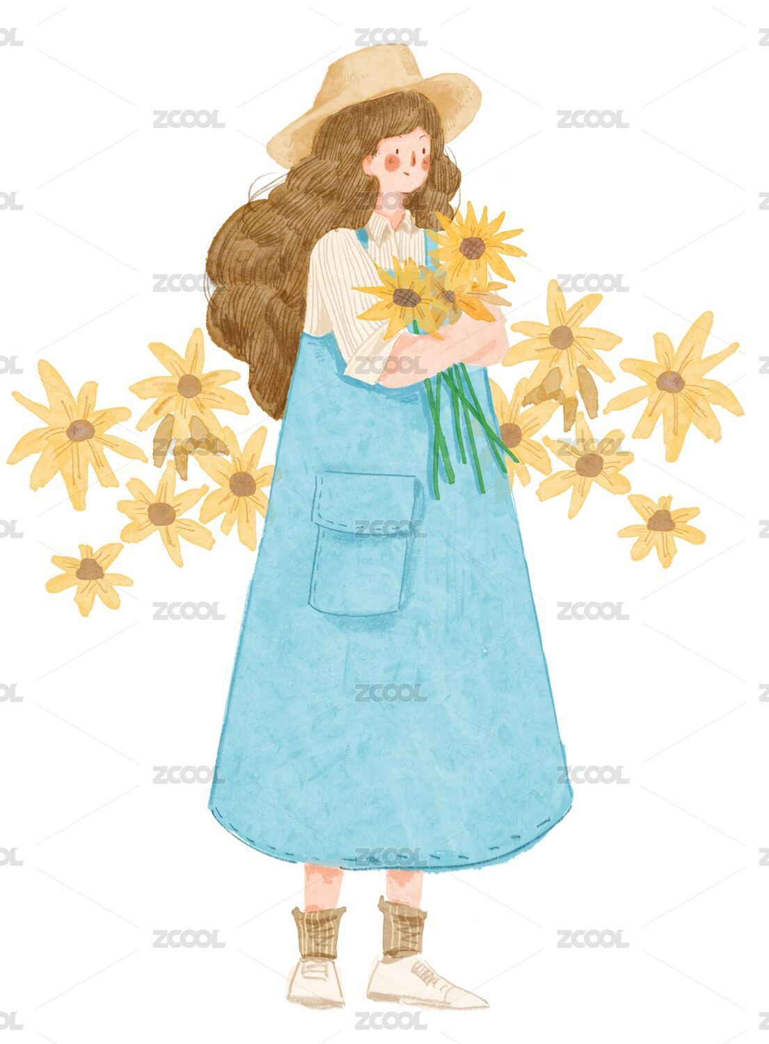小清新,少女插画,水彩人物,全身,春天,捧花,拎篮子,春风,草帽,抬头