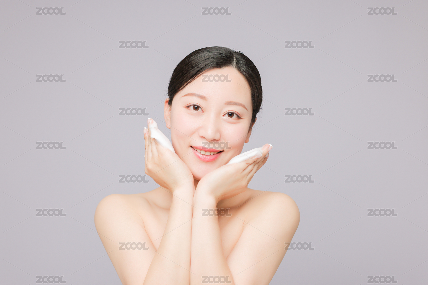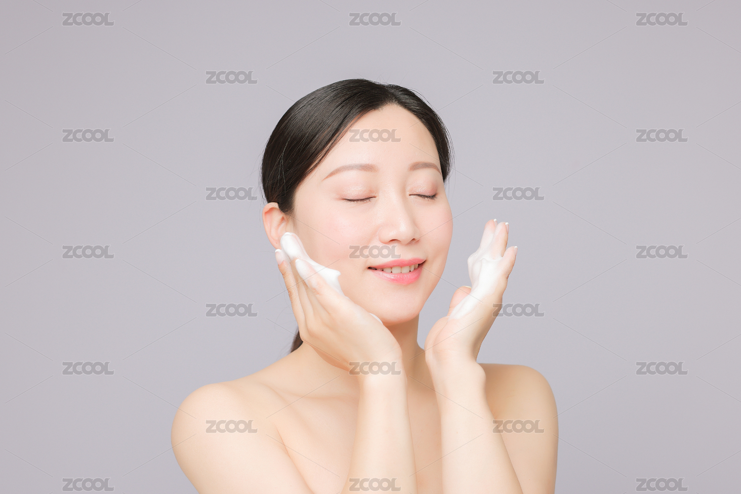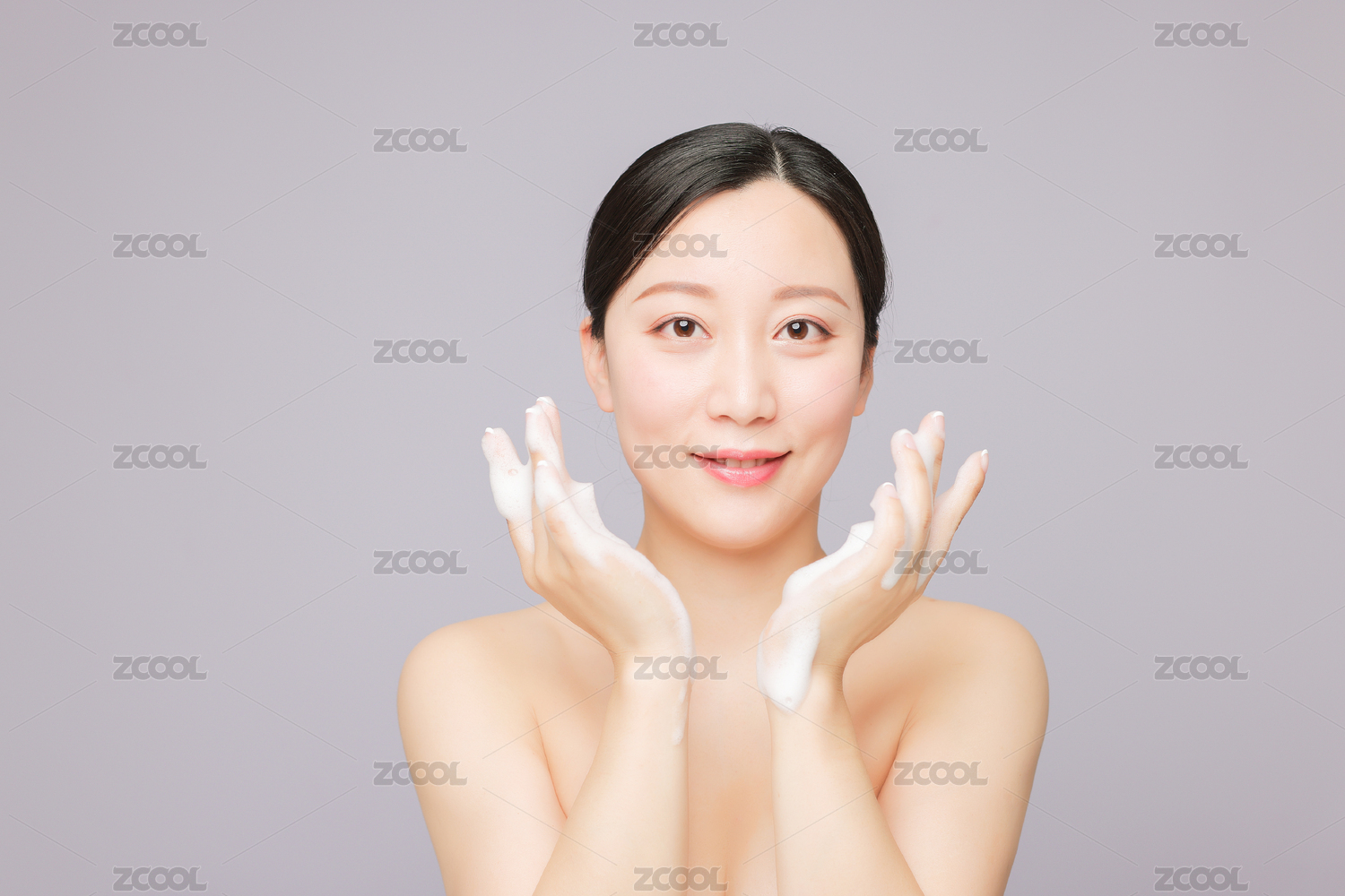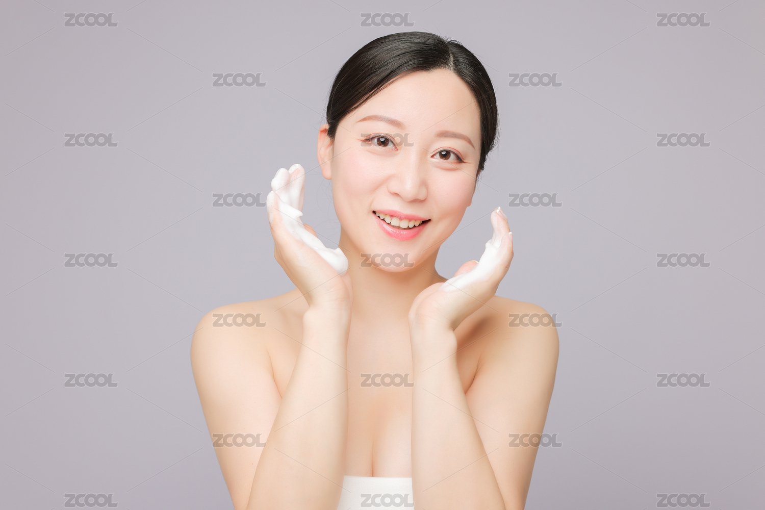 灰色背景里正在使用洗面奶的亚洲美女面部特写,化妆护肤整容