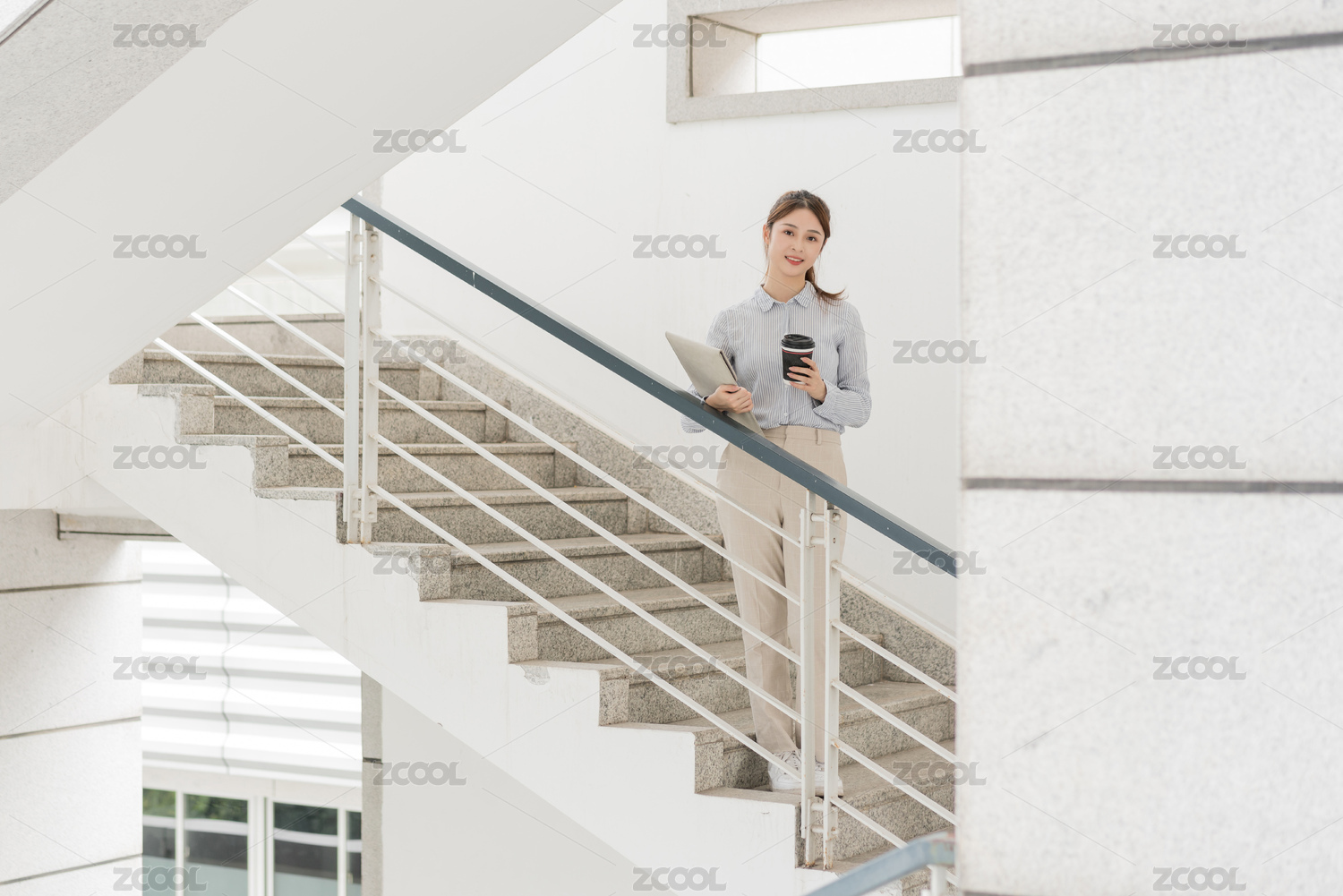 一个业务小姐在介绍到办公室小姐的主管上司携带用手势平板电脑。他们走在楼梯上。上的上述观点。