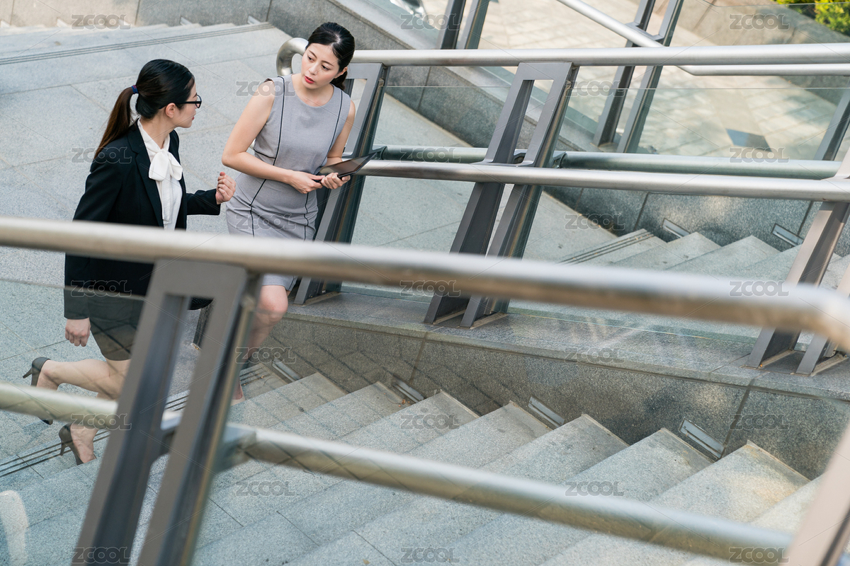 两次成功的亚洲女性走在楼梯上,并与各other.On的后视图聊天。他们要参加一个会议。两人穿着正式西装,高高的山岗。一是平板电脑携带一个手提袋。
