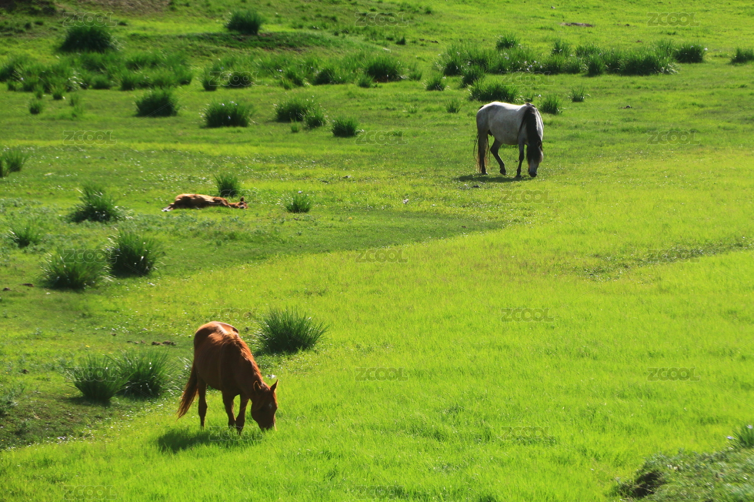 辉腾锡勒草原上悠闲吃草的蒙古马