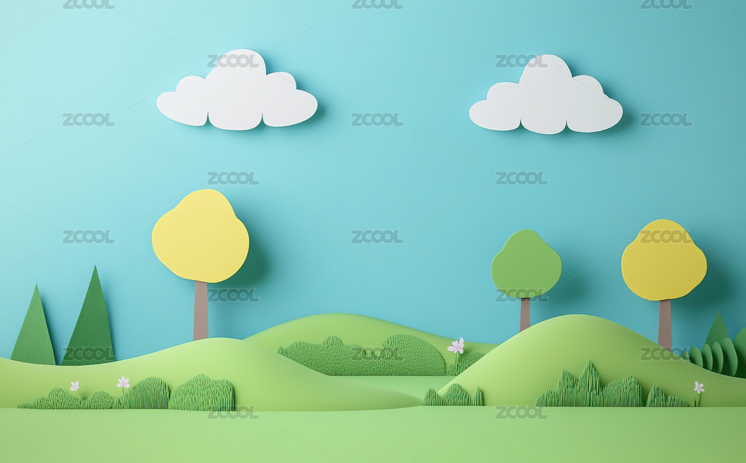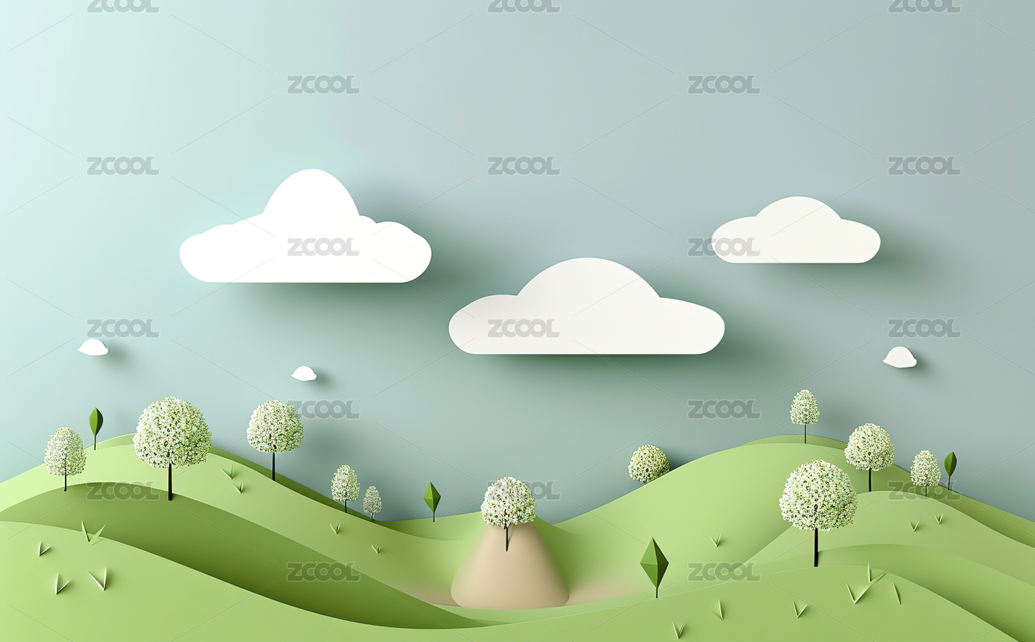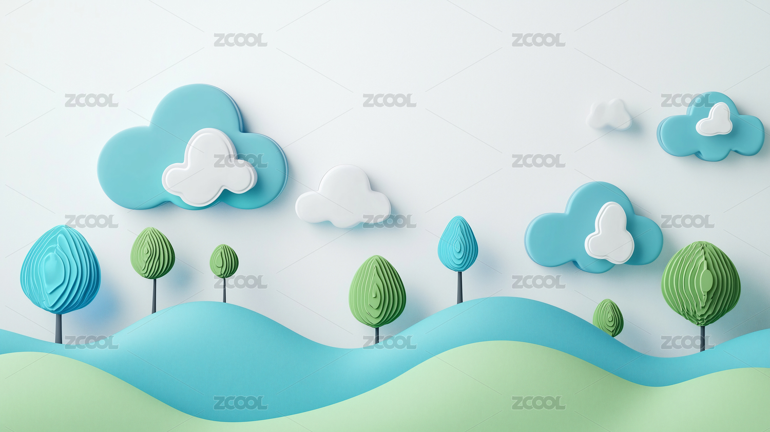 夏天在绿色背景下的蓝色云朵下的蓝色背景
