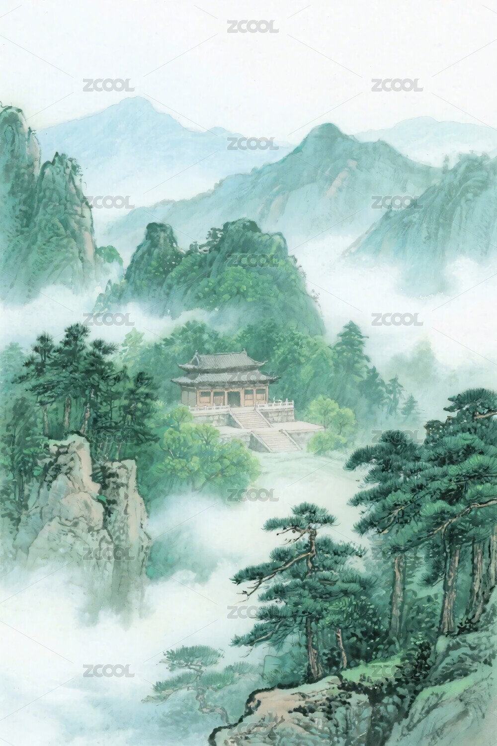 水墨山川寺庙风景画