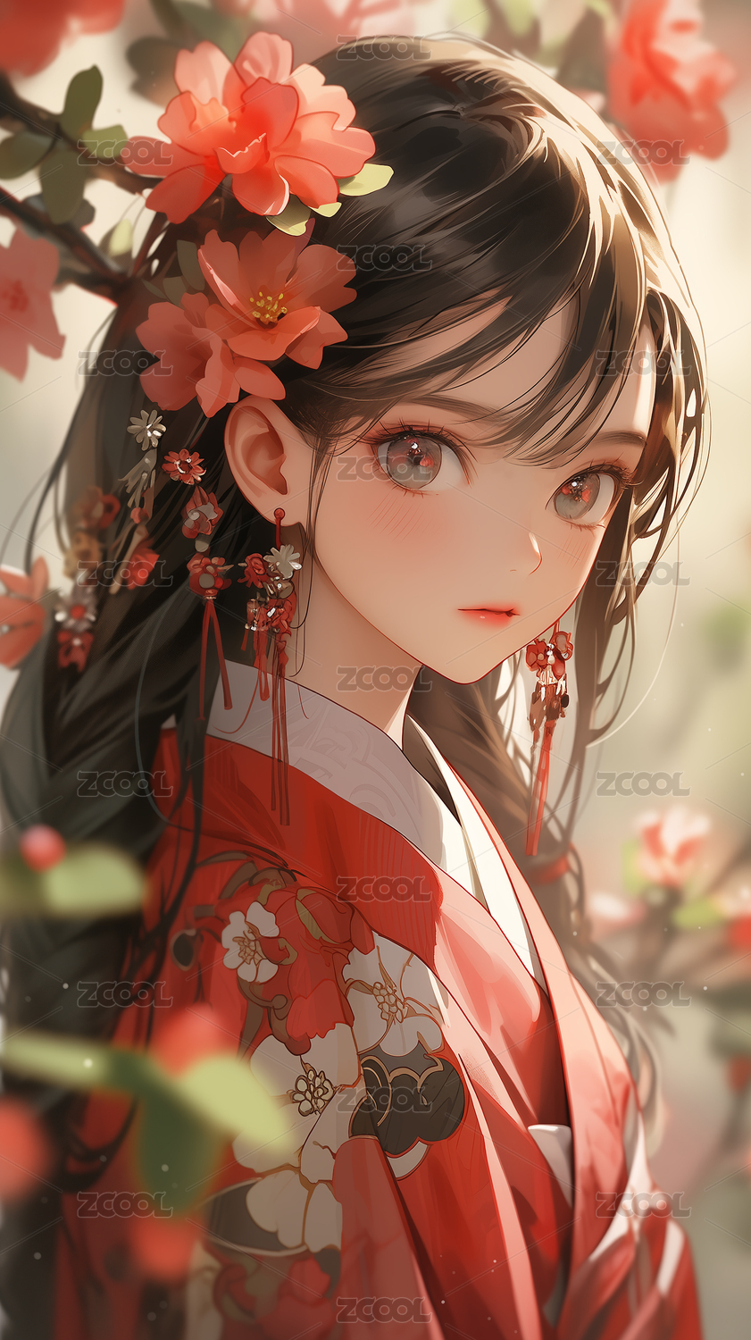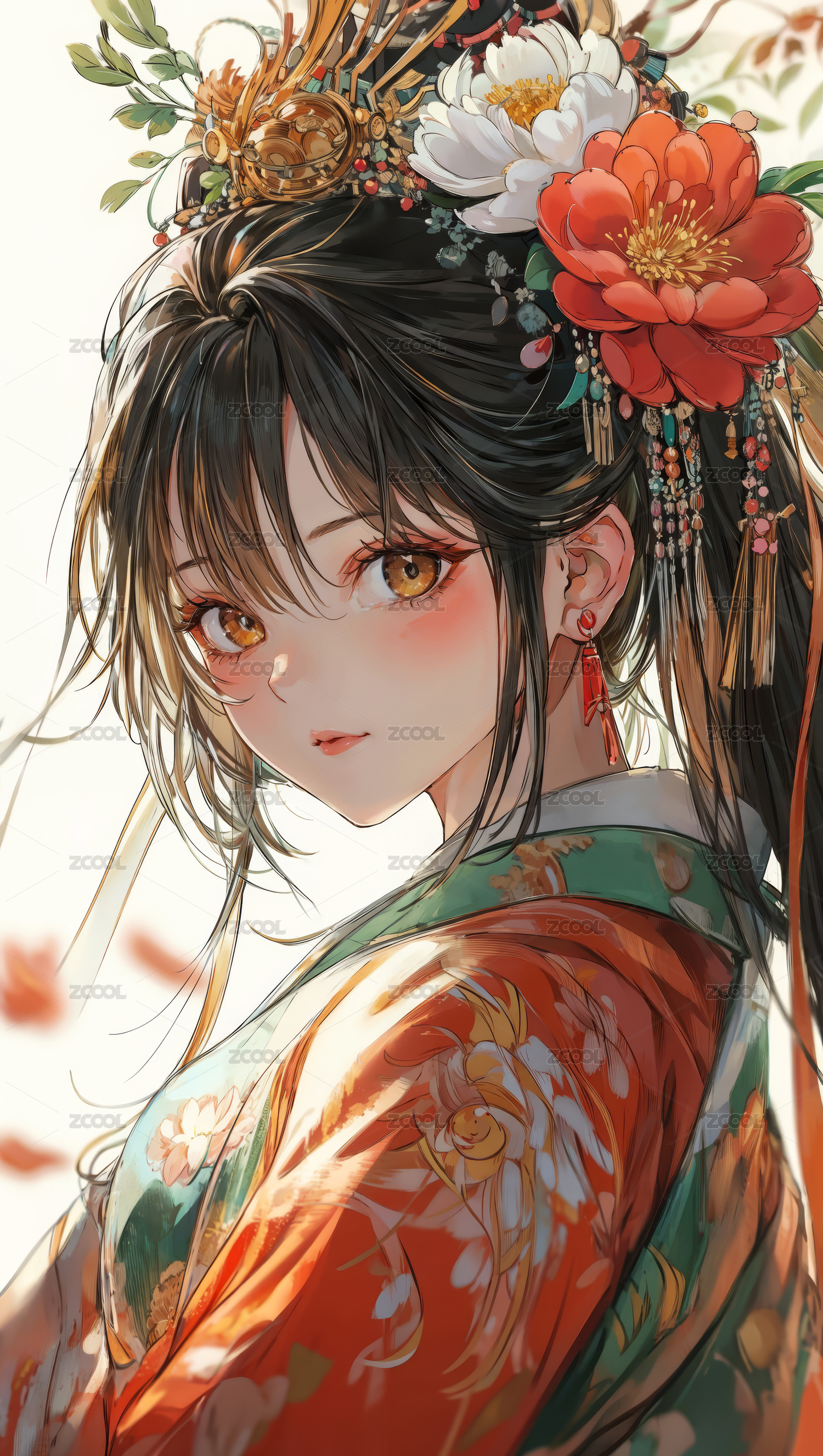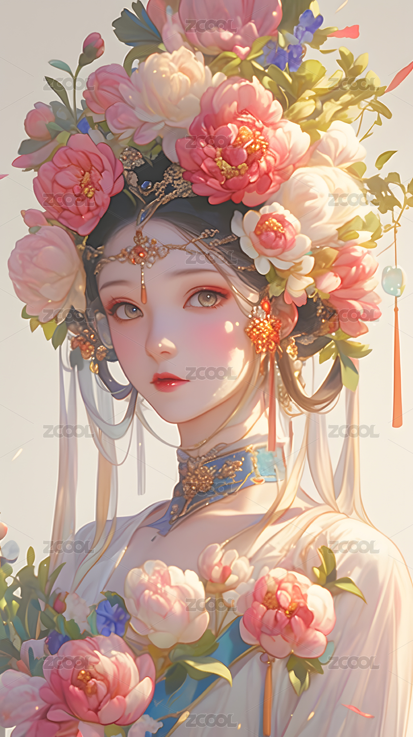 配戴牡丹花头饰的中国古典美女
