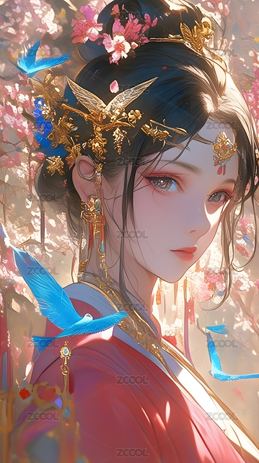 华丽服饰女子与蓝色飞鸟唯美意境
