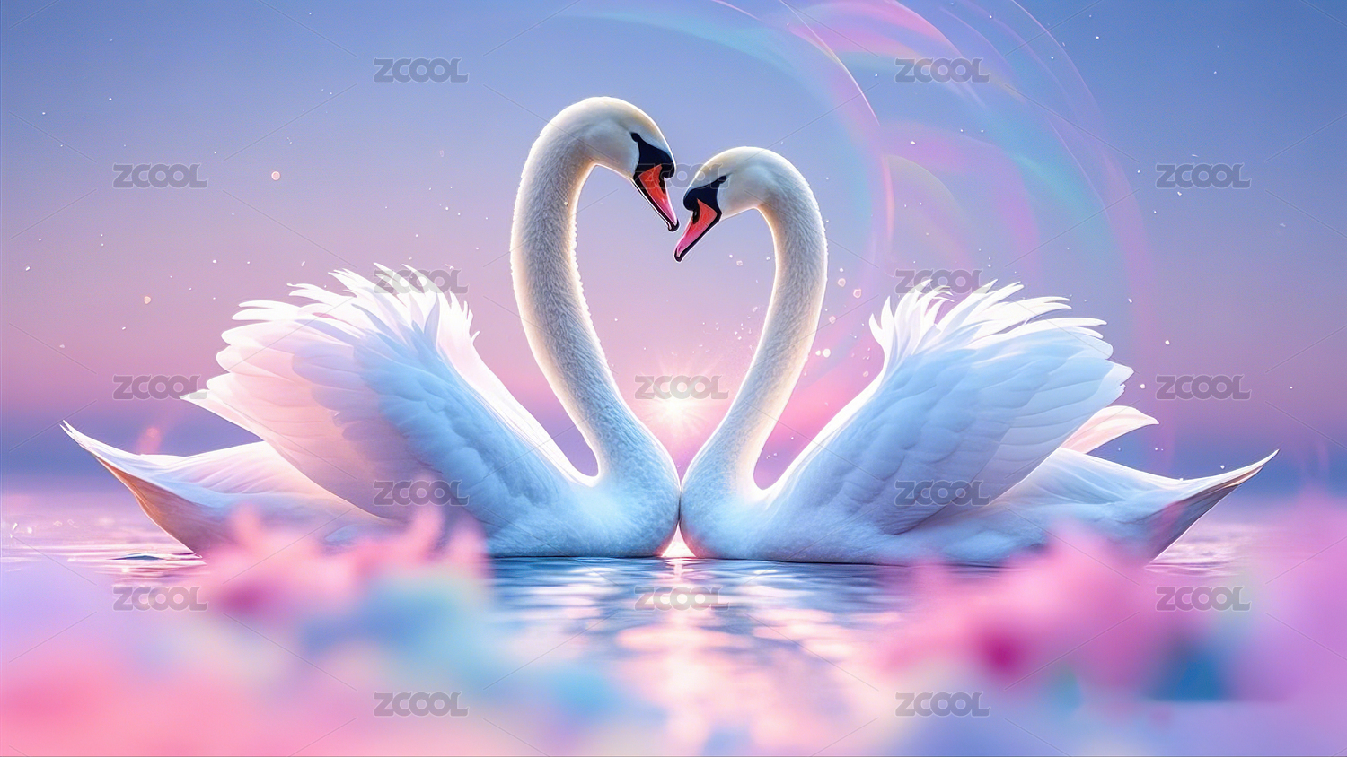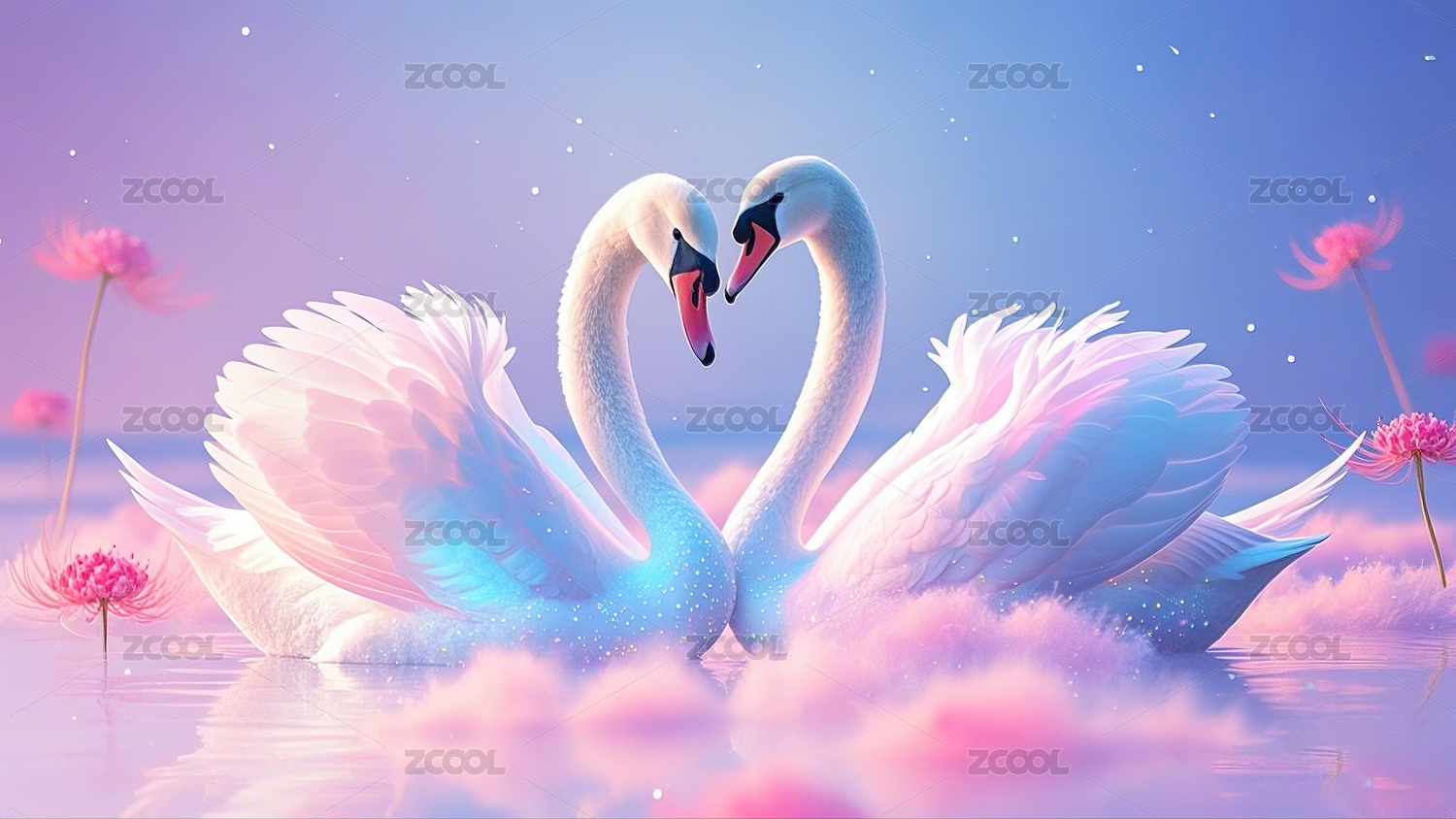 心形交颈天鹅相依相偎,粉色浪漫星空唯美
