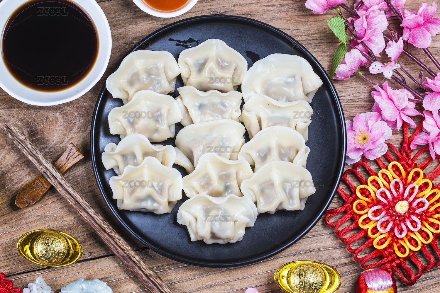 桌子上的饺子和春节装饰品